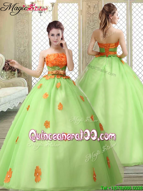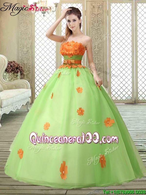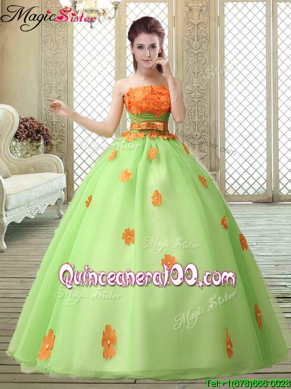 Neckline : StraplessShown Color : Spring GreenSilhouette : Ball GownsSleeve Length : sleevelessHemline : floor lengthBack Detail : Lace upFabric : OrganzaEmbellishment : Appliques,BeltOccasion : Military Ball,Sweet 16,QuinceaneraSeason : Spring,Summer,Fall,Winter