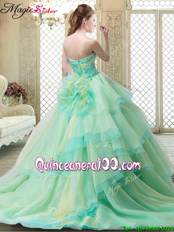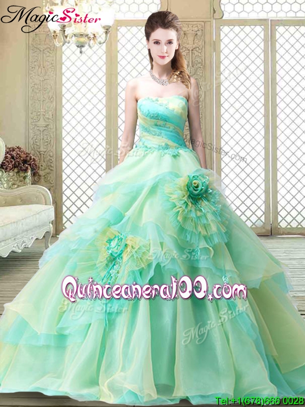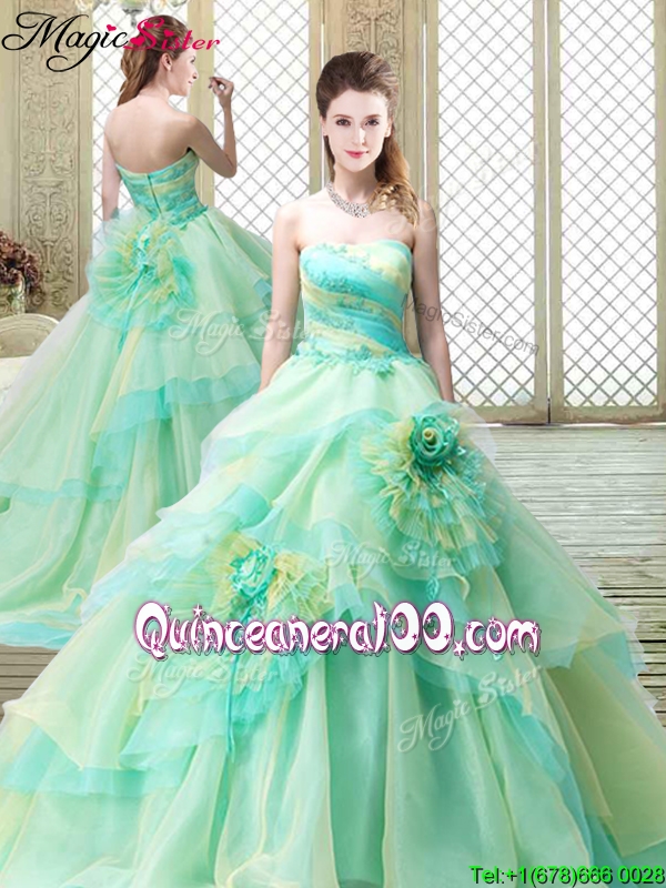 Neckline : StraplessShown Color : Multi-colorSilhouette : Ball GownsSleeve Length : sleevelessHemline : with trainBack Detail : ZipperFabric : TulleEmbellishment : Hand Made FlowerOccasion : Military Ball,Sweet 16,QuinceaneraSeason : Spring,Summer,Fall,Winter