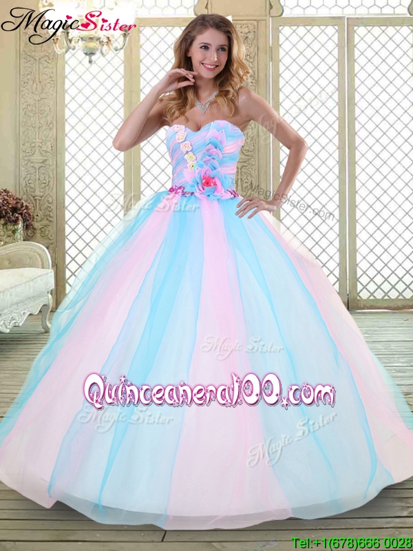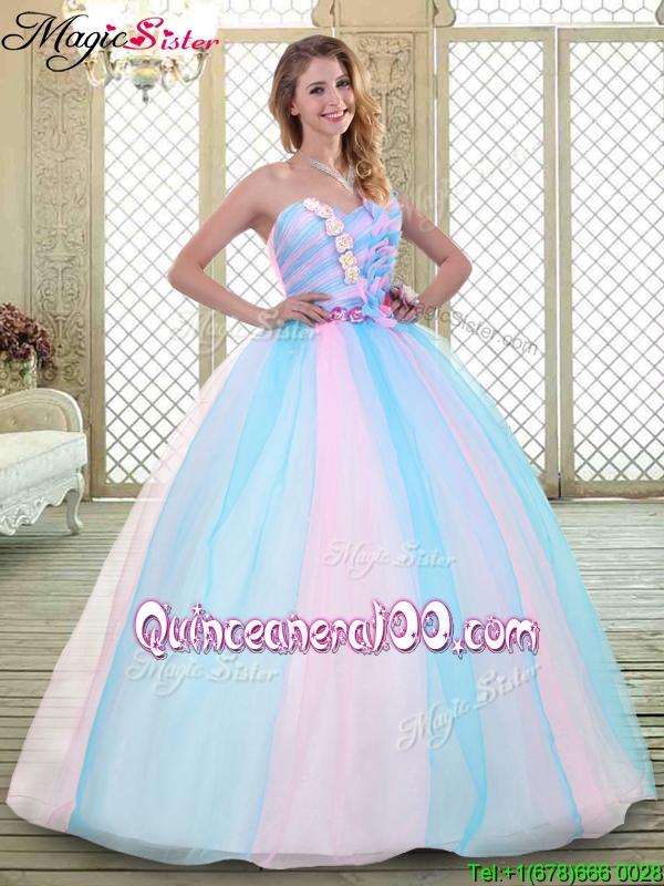 Neckline : SweetheartShown Color : Multi-colorSilhouette : Ball GownsSleeve Length : sleevelessHemline : floor lengthBack Detail : Lace upFabric : OrganzaEmbellishment : Hand Made FlowerOccasion : Military Ball,Sweet 16,QuinceaneraSeason : Spring,Summer,Fall,Winter