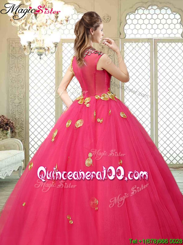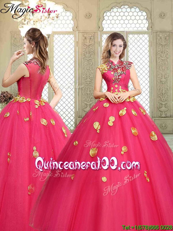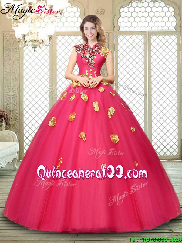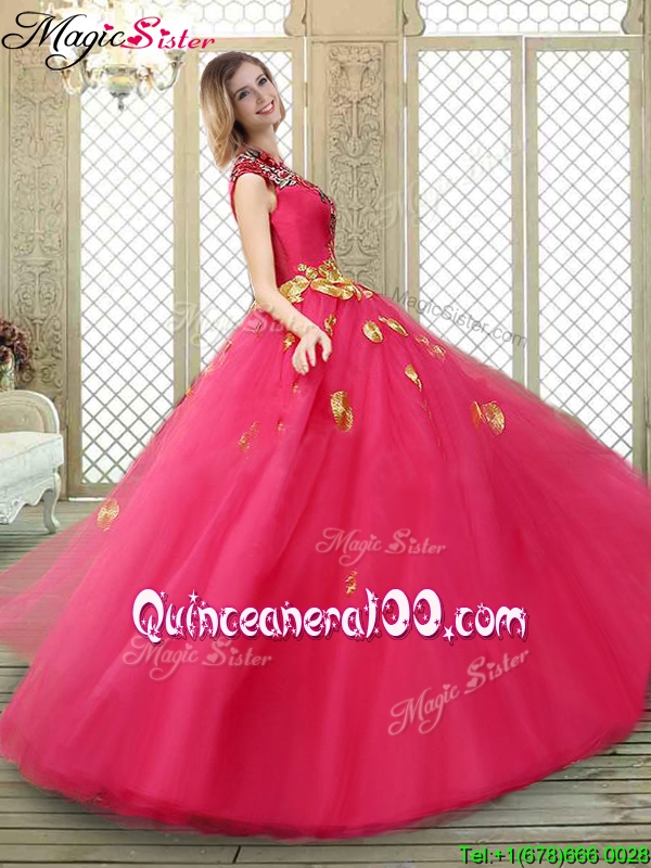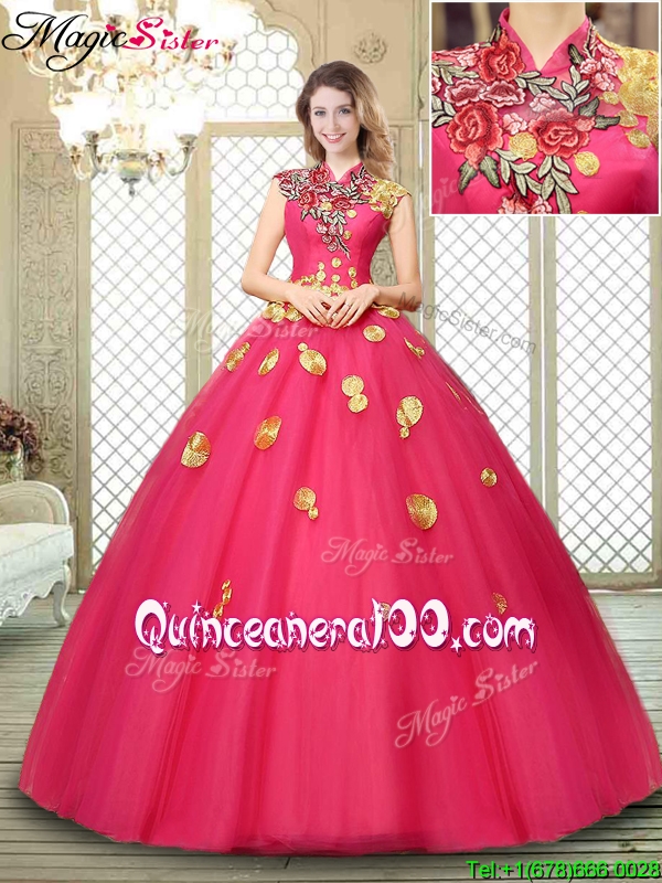 Neckline : High-neckShown Color : RedSilhouette : Ball GownsSleeve Length : sleevelessHemline : floor lengthBack Detail : Lace upFabric : OrganzaEmbellishment : AppliquesOccasion : Military Ball,Sweet 16,QuinceaneraSeason : Spring,Summer,Fall,Winter
