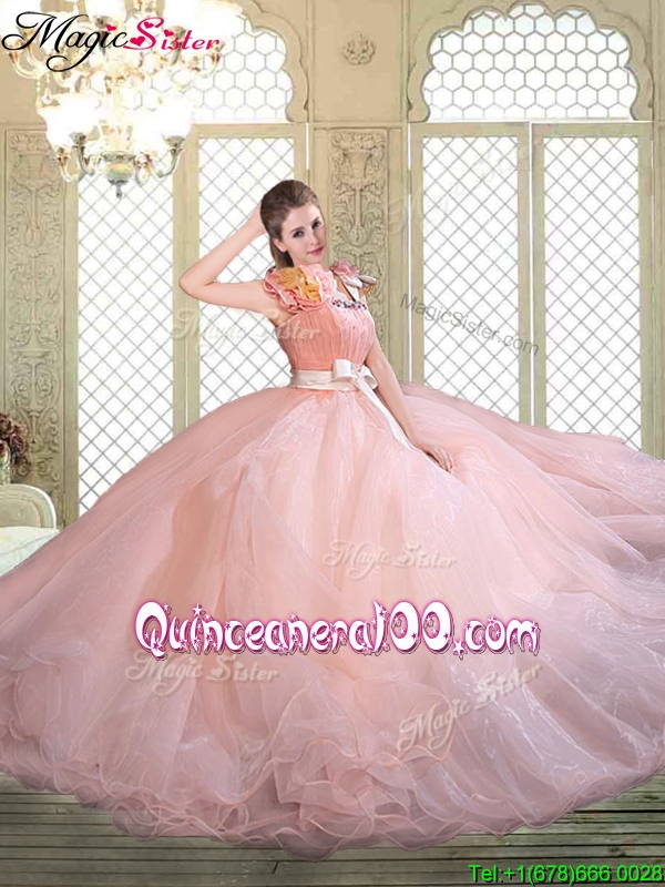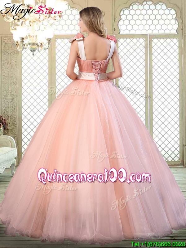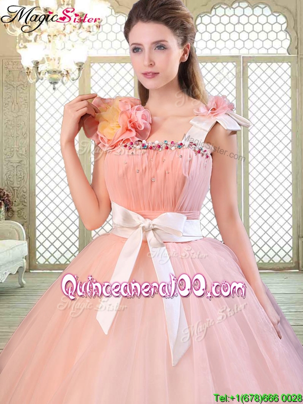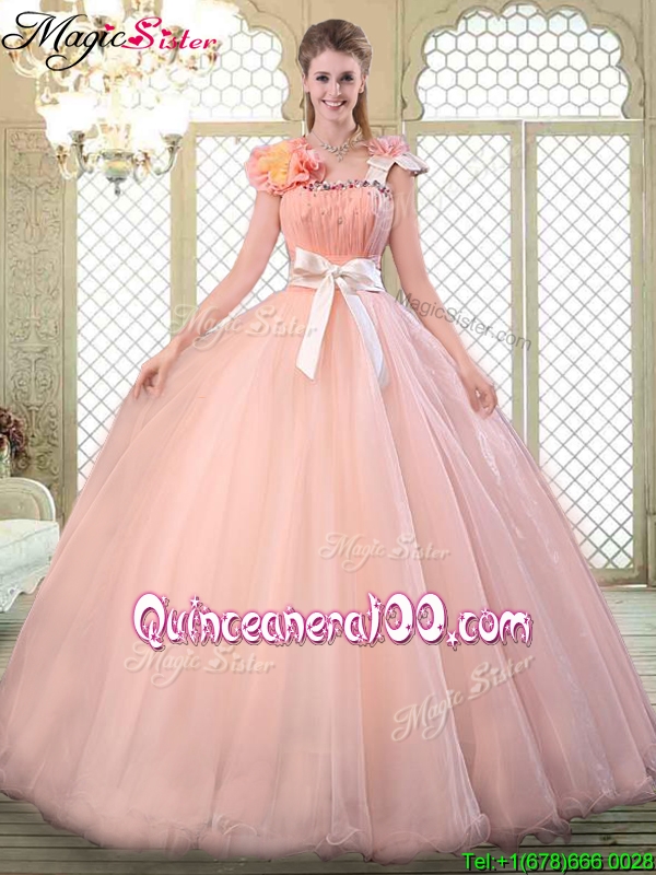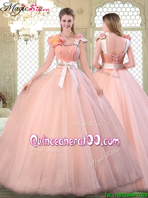 Neckline : AsymmetricShown Color : PeachSleeve Length : sleevelessHemline : floor lengthBack Detail : Lace upFabric : OrganzaEmbellishment : Hand Made FlowerOccasion : Military Ball,Sweet 16,QuinceaneraSeason : Spring,Summer,Fall,Winter