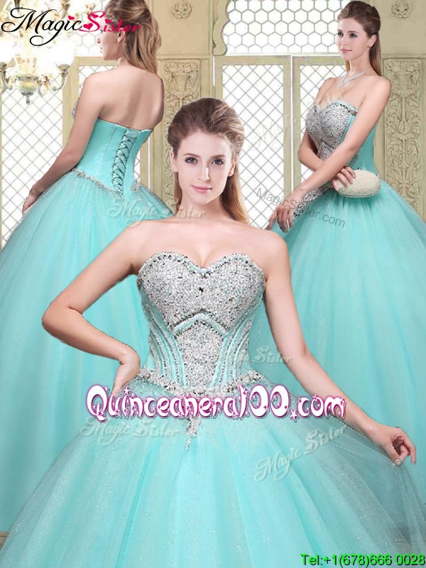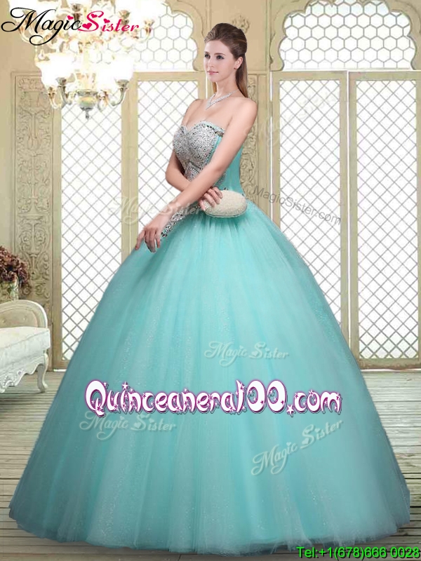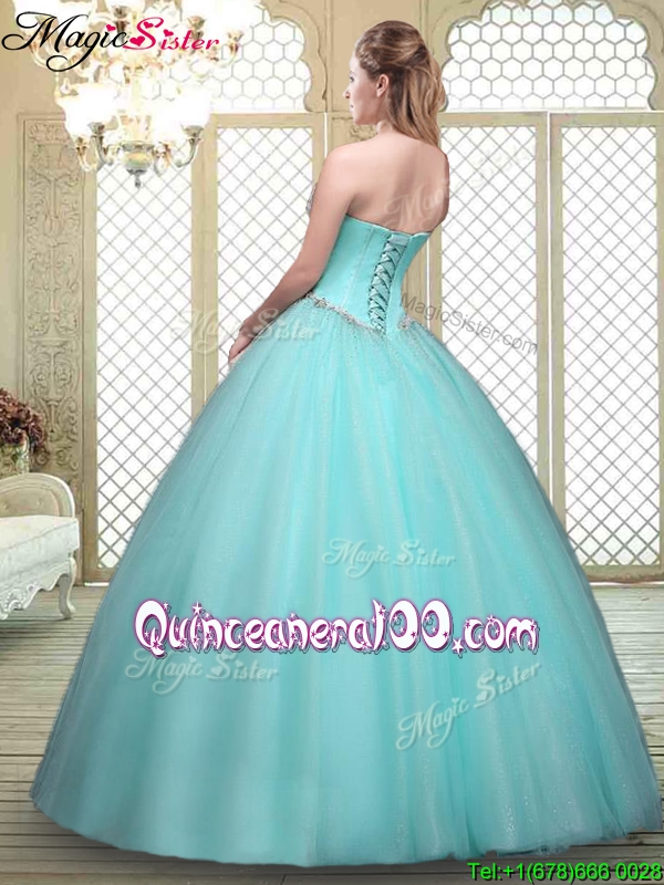 Neckline : SweetheartShown Color : Aqua BlueSilhouette : Ball GownsSleeve Length : sleevelessHemline : floor lengthBack Detail : Lace upFabric : TulleEmbellishment : BeadingOccasion : Military Ball,Sweet 16,QuinceaneraSeason : Spring,Summer,Fall,Winter