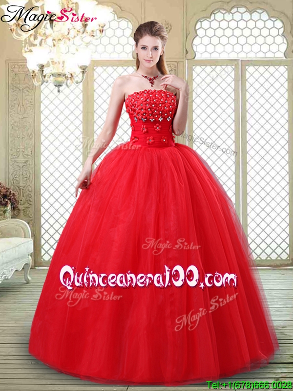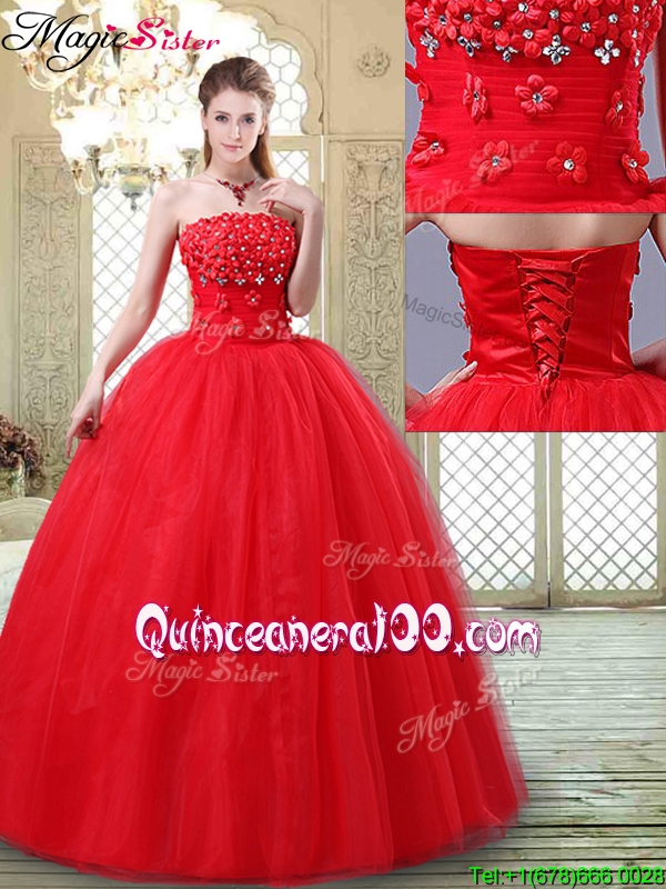 Neckline : StraplessShown Color : RedSleeve Length : sleevelessHemline : floor lengthBack Detail : Lace upFabric : TulleEmbellishment : Beading,Hand Made FlowerOccasion : Military Ball,Sweet 16,QuinceaneraSeason : Summer,Fall,Winter