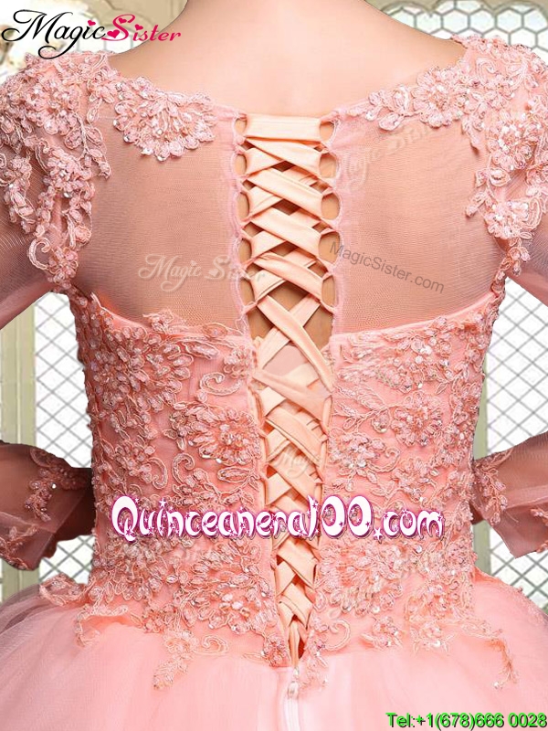 Neckline : BateauShown Color : PeachSleeve Length : sleevelessHemline : floor lengthBack Detail : Lace upFabric : TulleEmbellishment : Beading,AppliquesOccasion : Military Ball,Sweet 16,QuinceaneraSeason : Spring,Summer,Fall,Winter