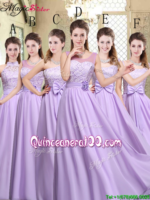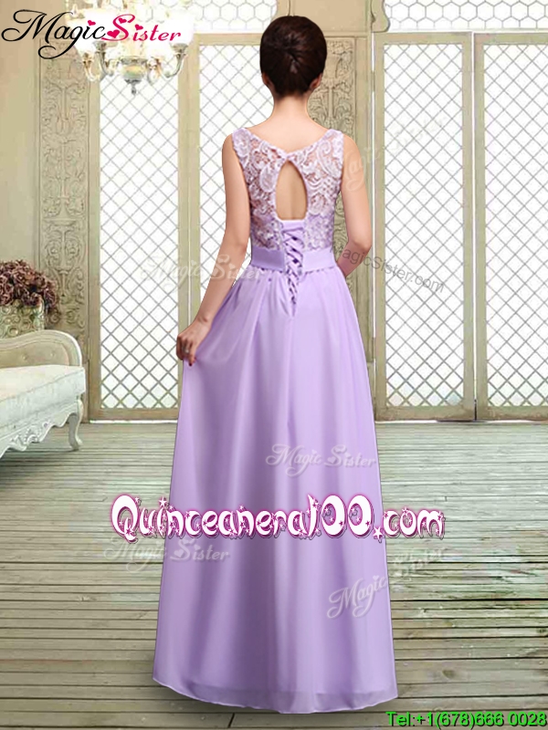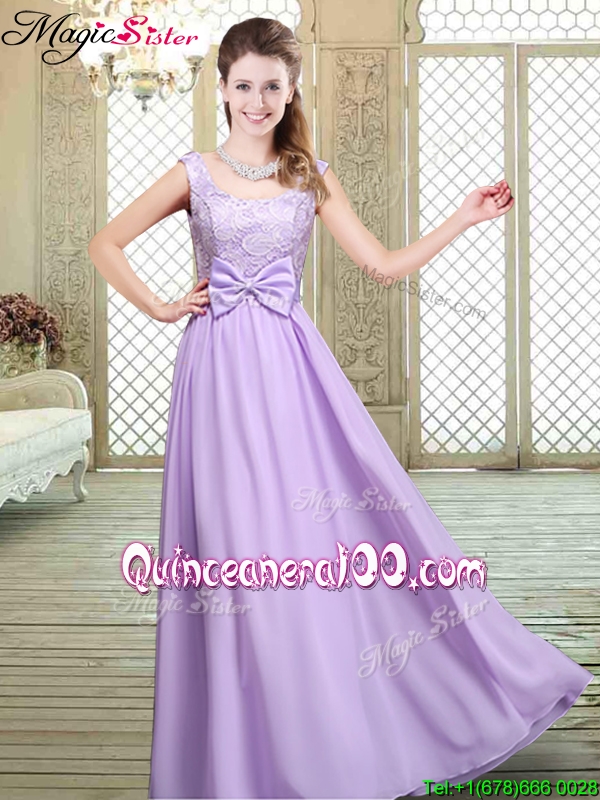 Neckline : ScoopShown Color : LavenderSilhouette : EmpireSleeve Length : sleevelessHemline : floor lengthBack Detail : Lace upFabric : ChiffonEmbellishment : Lace,BowknotOccasion : Prom,Party,Wedding PartySeason : Spring,Summer,Fall,Winter