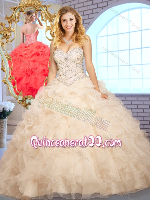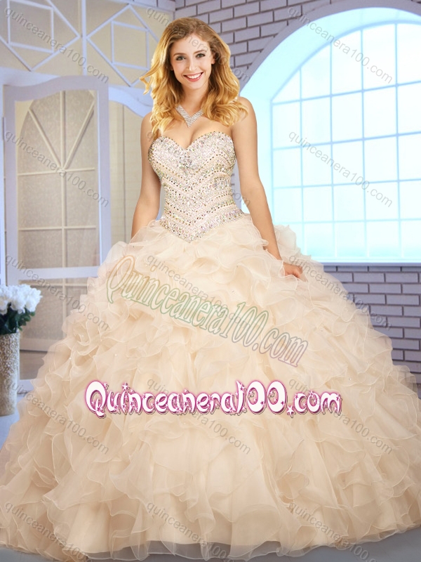 Neckline : SweetheartShown Color : ChampagneSilhouette : Ball GownsSleeve Length : sleevelessHemline : floor lengthBack Detail : Lace upFabric : OrganzaEmbellishment : Beading,RufflesOccasion : Military Ball,Sweet 16,QuinceaneraSeason : Spring,Summer,Fall,Winter
