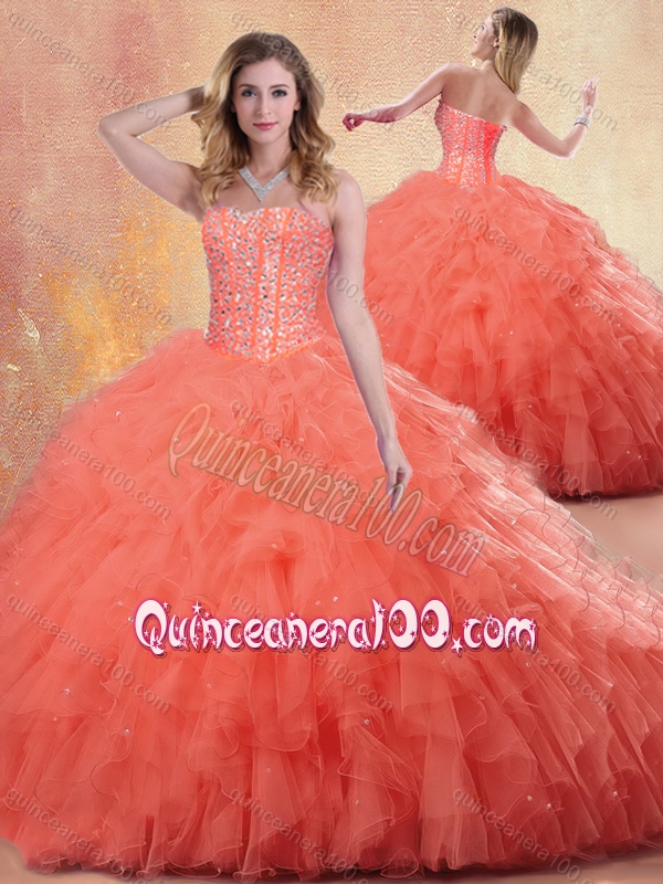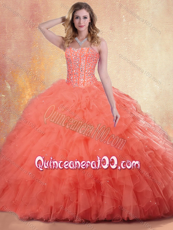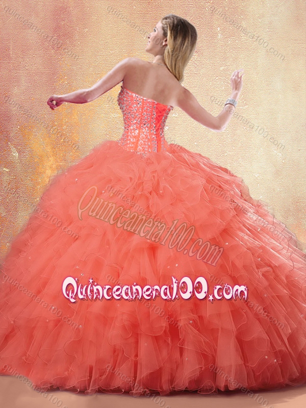 Neckline : SweetheartShown Color : Orange RedSleeve Length : sleevelessHemline : floor lengthBack Detail : Lace upFabric : OrganzaEmbellishment : Beading,RufflesOccasion : Military Ball,Sweet 16,QuinceaneraSeason : Spring,Summer,Fall,Winter