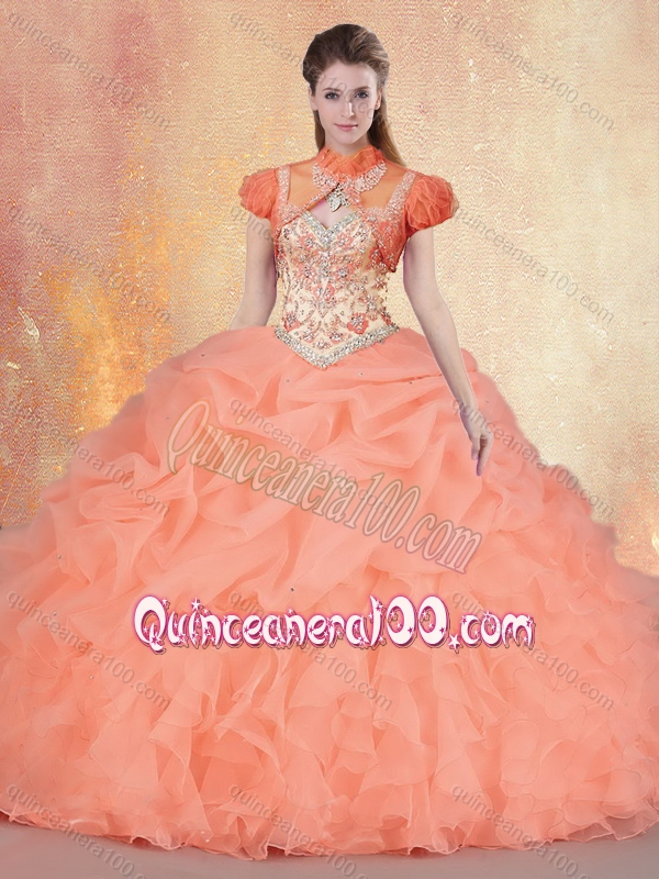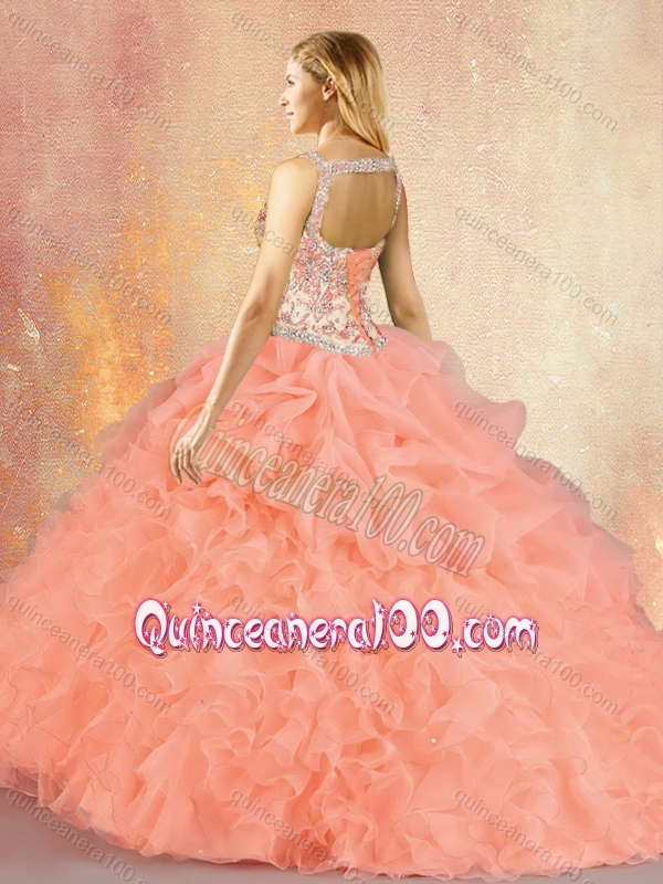 Neckline : StrapsShown Color : PeachSleeve Length : sleevelessHemline : with trainBack Detail : Criss crossFabric : OrganzaEmbellishment : Beading,Ruffles,Pick UpsOccasion : Military Ball,Sweet 16,QuinceaneraSeason : Spring,Summer,Fall,Winter