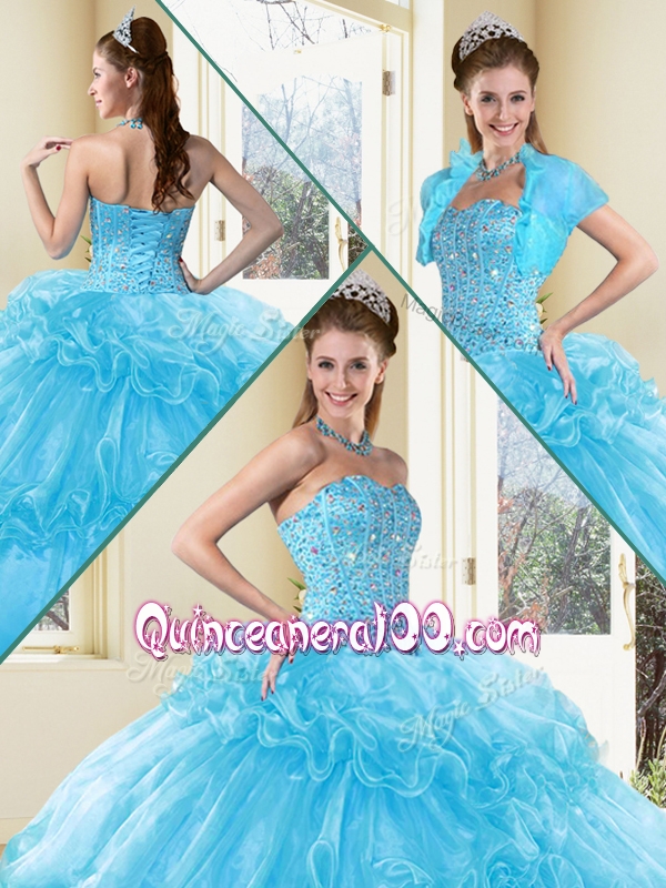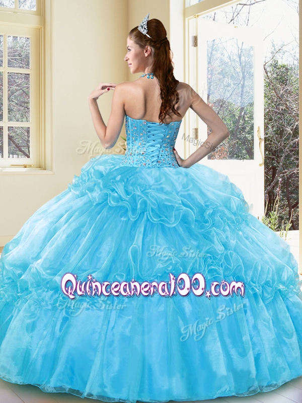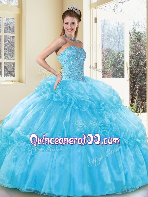 Neckline : SweetheartShown Color : Aqua BlueSilhouette : Ball GownsSleeve Length : sleevelessHemline : floor lengthBack Detail : Lace upFabric : OrganzaEmbellishment : Beading,Ruffled LayersOccasion : Military Ball,Sweet 16,QuinceaneraSeason : Spring,Summer,Fall,Winter