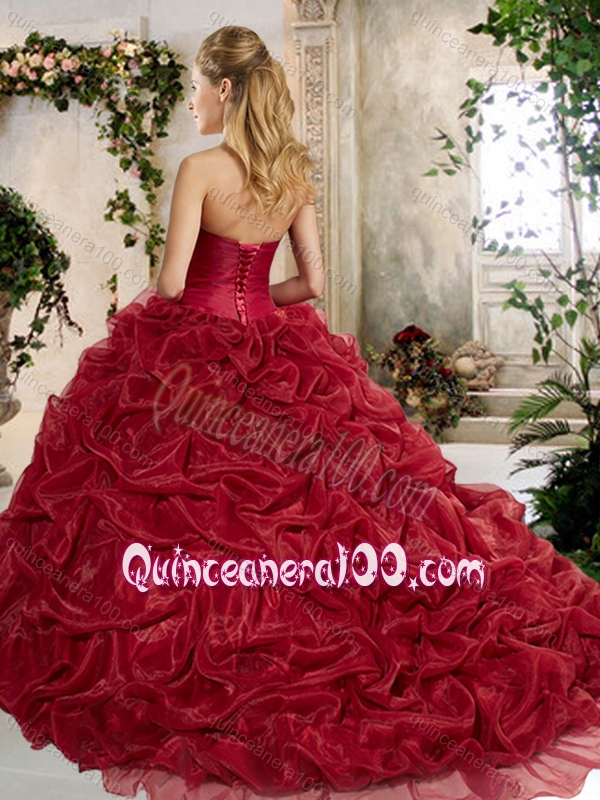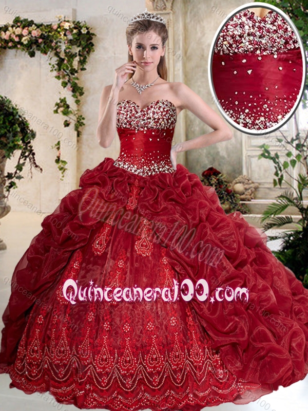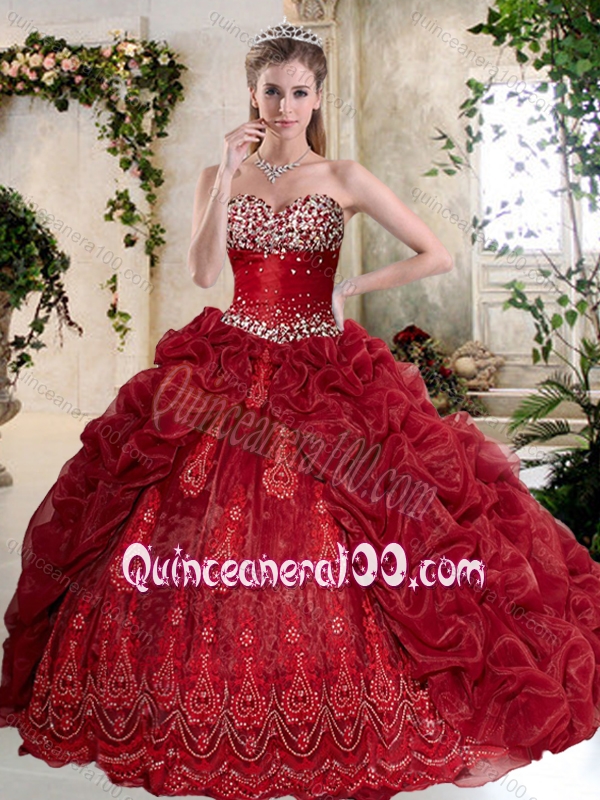 Neckline : SweetheartShown Color : Wine RedSilhouette : Ball GownsSleeve Length : sleevelessHemline : with trainBack Detail : Lace upFabric : OrganzaEmbellishment : Beading,Embroidery,Pick UpsOccasion : Military Ball,Sweet 16,QuinceaneraSeason : Spring,Summer,Fall,Winter