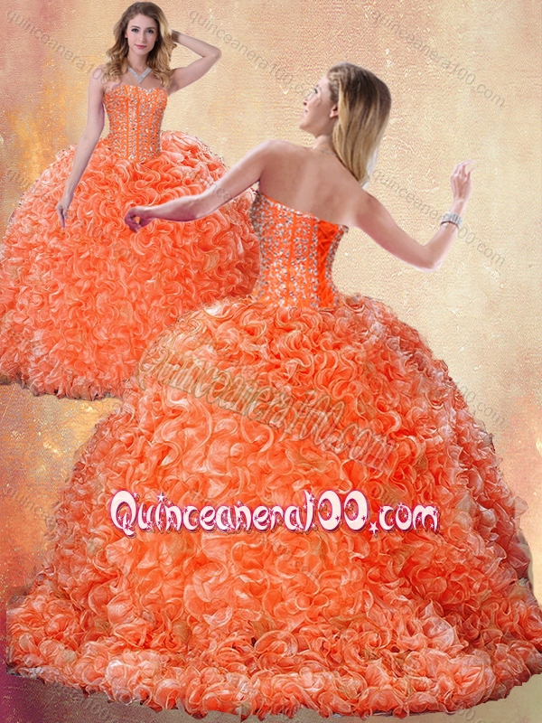 2016 Cheap Brush Train Orange Quinceanera Dresses with Beading and Ruffles