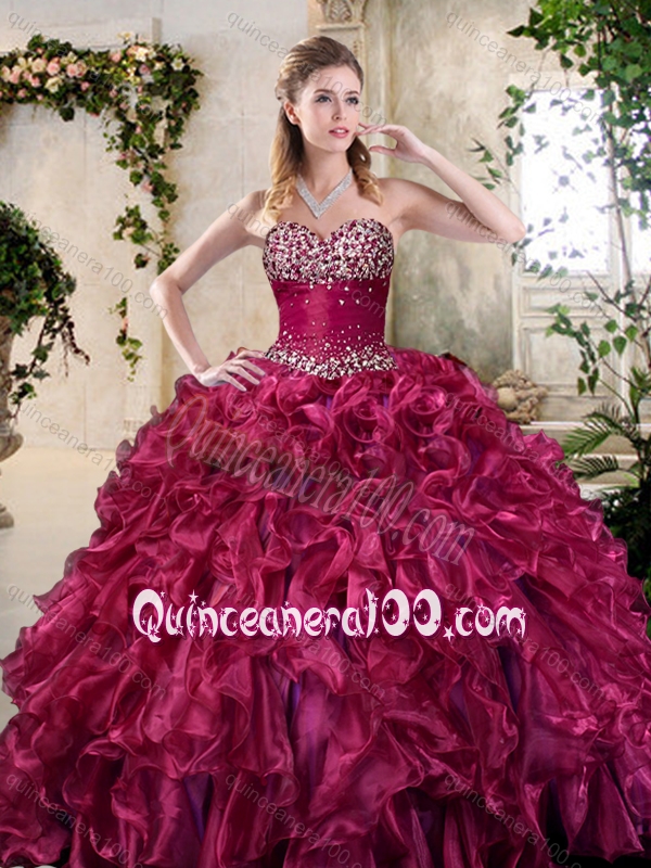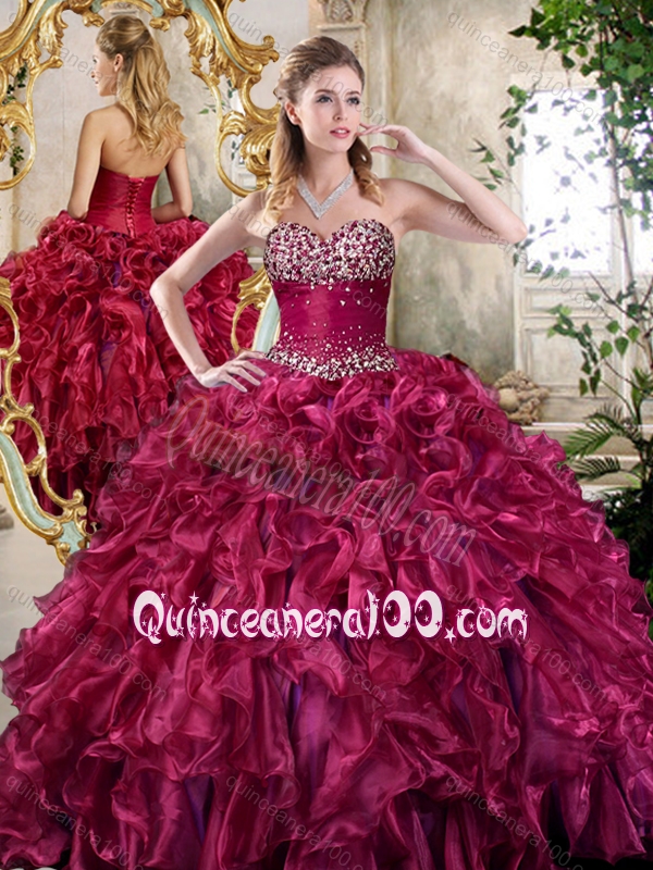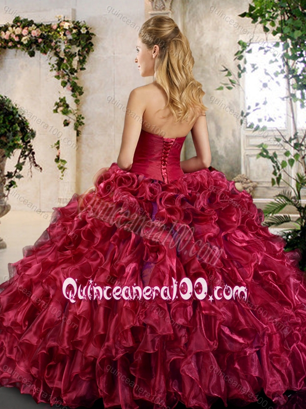 Neckline : SweetheartShown Color : BurgundySleeve Length : sleevelessHemline : floor lengthBack Detail : Lace upFabric : OrganzaEmbellishment : Beading,RufflesOccasion : Military Ball,Sweet 16,QuinceaneraSeason : Spring,Summer,Fall,Winter