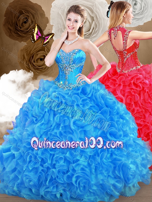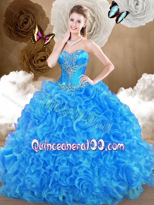 Neckline : SweetheartShown Color : BlueSleeve Length : sleevelessHemline : floor lengthBack Detail : Lace upFabric : OrganzaEmbellishment : Beading,RufflesOccasion : Military Ball,Sweet 16,QuinceaneraSeason : Spring,Summer,Fall,Winter