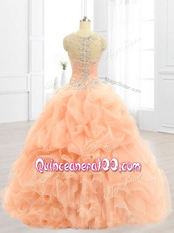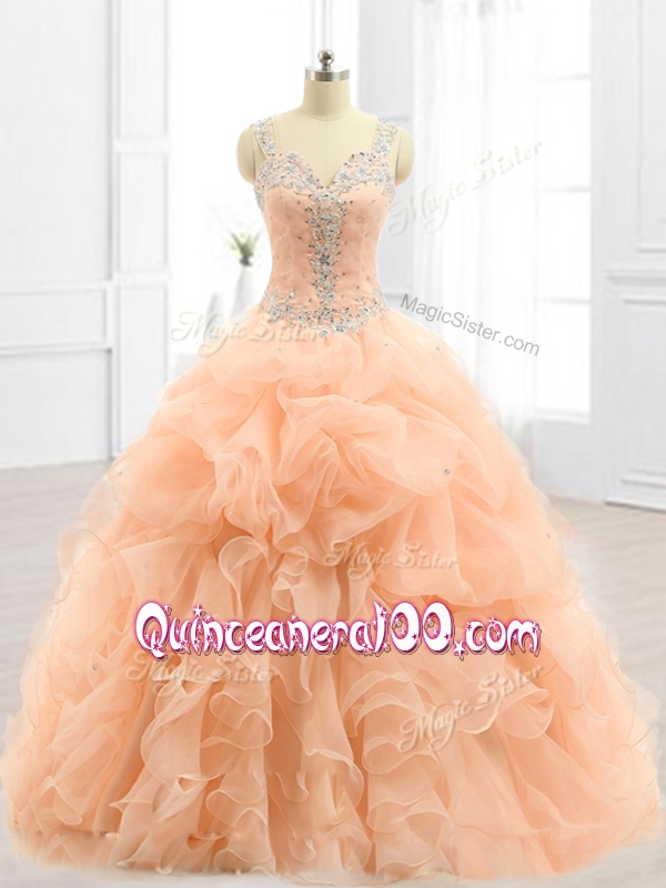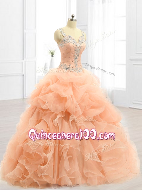Neckline : StrapsShown Color : PeachSilhouette : Ball GownsSleeve Length : sleevelessHemline : floor lengthBack Detail : ZipperFabric : OrganzaEmbellishment : Beading,RufflesOccasion : Military Ball,Sweet 16,QuinceaneraSeason : Spring,Summer,Fall,Winter