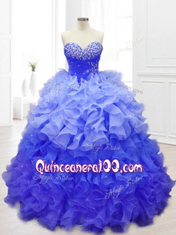 Neckline : SweetheartShown Color : BlueSleeve Length : sleevelessHemline : floor lengthBack Detail : Lace upFabric : OrganzaEmbellishment : Beading,RufflesOccasion : Military Ball,Sweet 16,QuinceaneraSeason : Spring,Summer,Fall,Winter