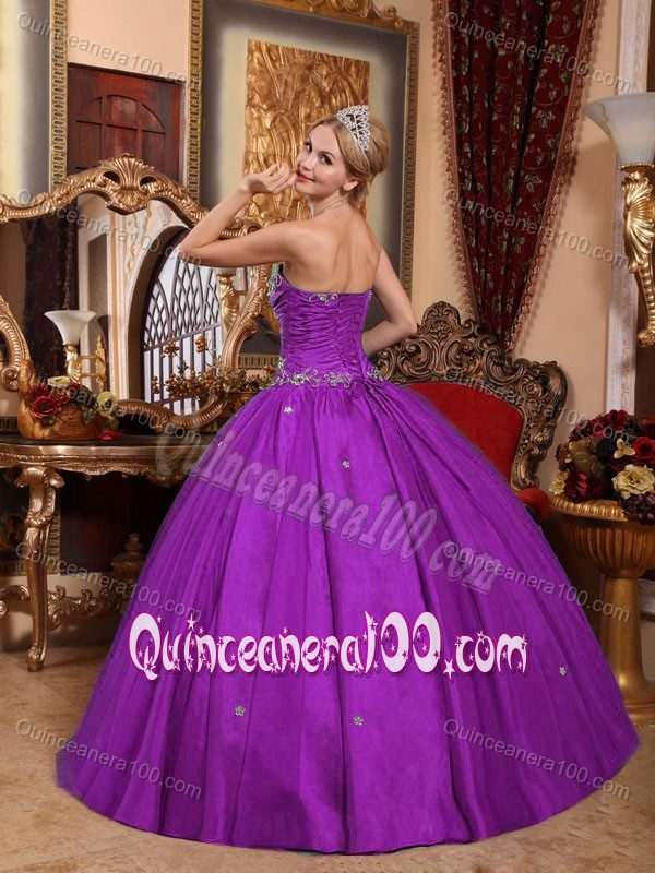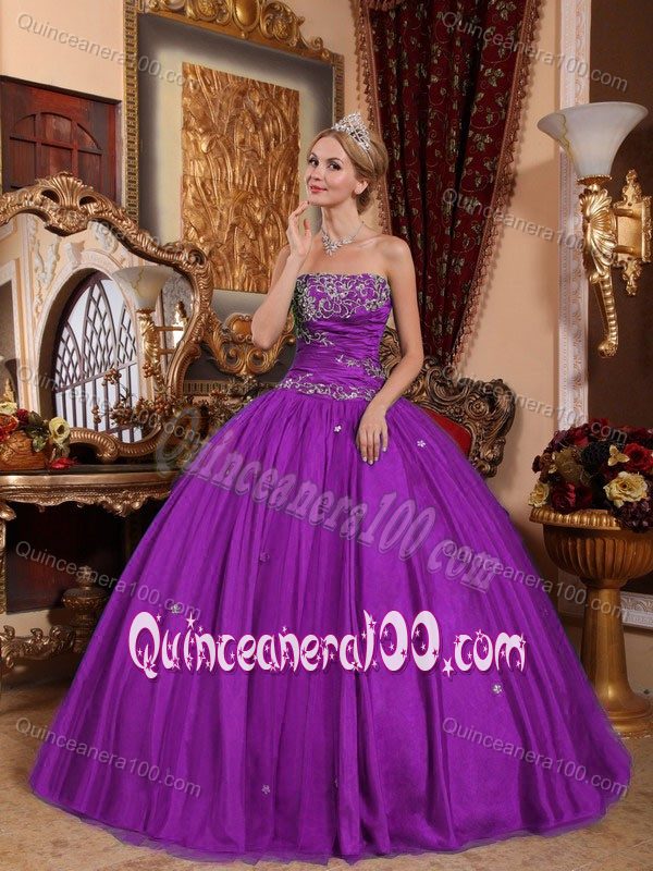 Neckline : StraplessShown Color : PurpleSilhouette : Ball GownsSleeve Length : sleevelessHemline : floor lengthBack Detail : Lace upFabric : Taffeta,TulleEmbellishment : Appliques,RuchingOccasion : Military Ball,Sweet 16,QuinceaneraSeason : Spring,Summer
