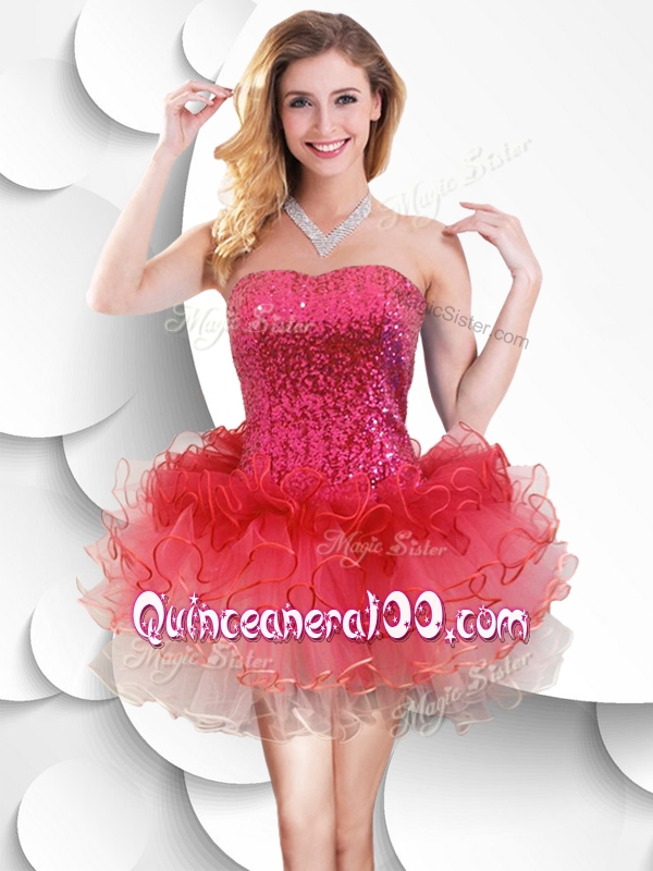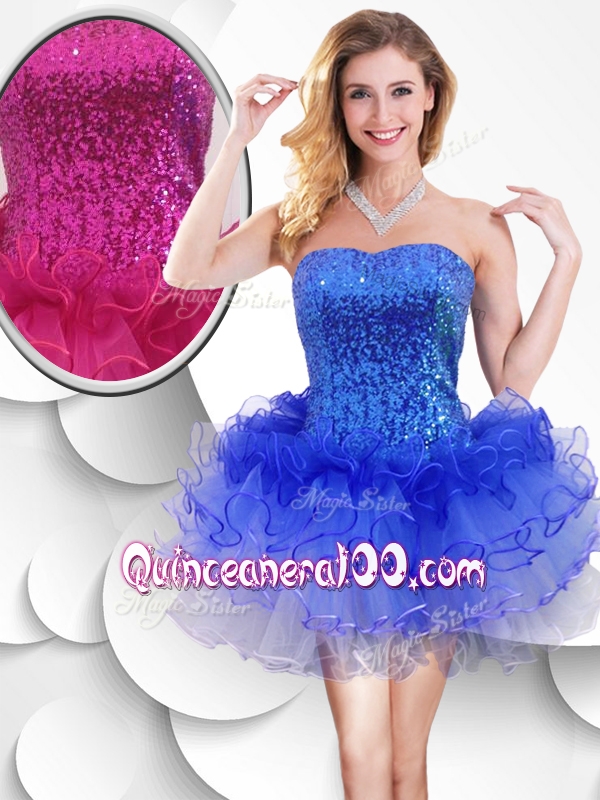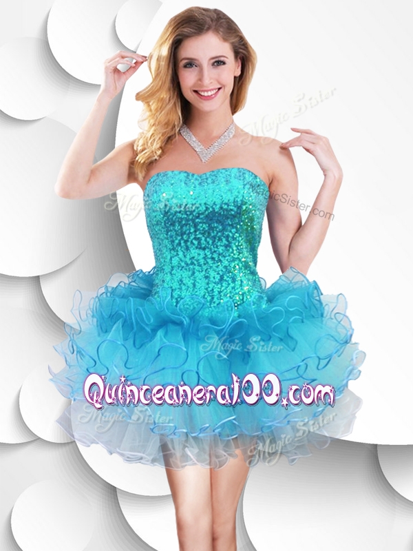 Neckline : StraplessShown Color : Red,Blue,Aqua Blue,Turquoise,Spring Green,Fuchsia,YellowSilhouette : ShortSleeve Length : sleevelessHemline : mini lengthBack Detail : Lace upFabric : OrganzaEmbellishment : Ruffles,SequinsOccasion : Prom,Party,Wedding PartySeason : Spring,Summer,Fall,Winter
