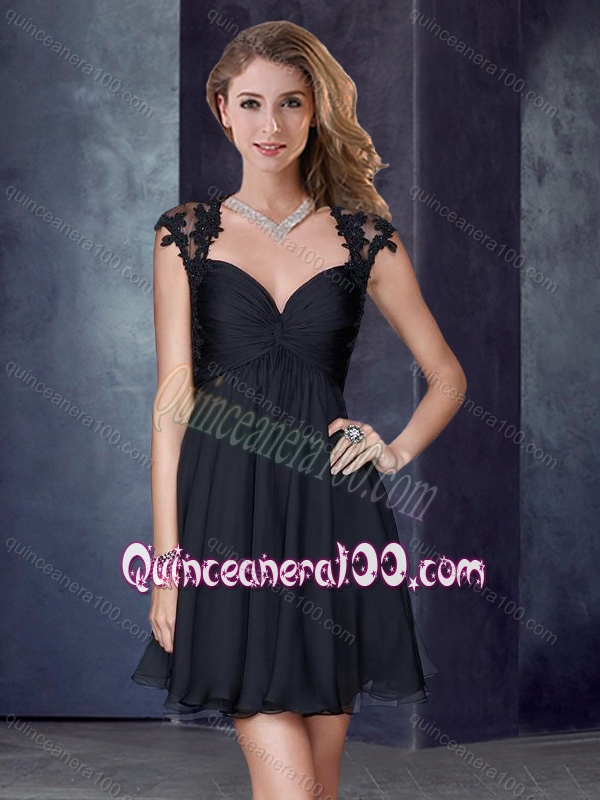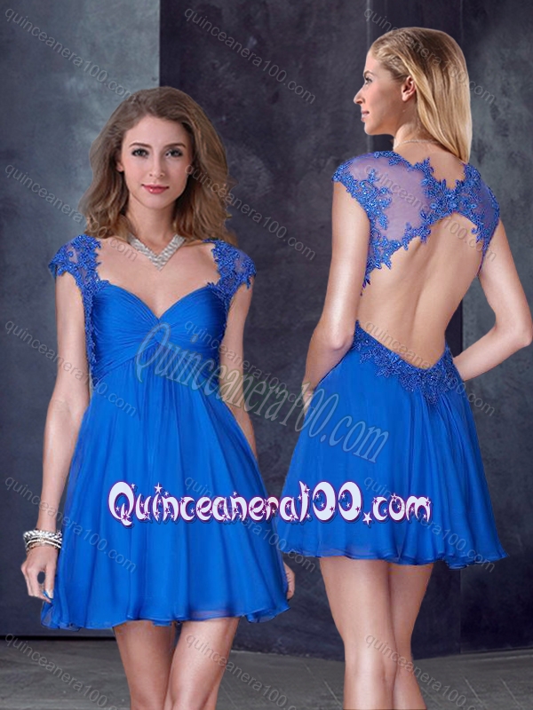 Neckline : V-neckShown Color : Black,BlueSleeve Length : cap sleevesHemline : mini lengthBack Detail : BacklessFabric : ChiffonEmbellishment : Beading,AppliquesOccasion : Prom,PartySeason : Spring,Summer,Fall