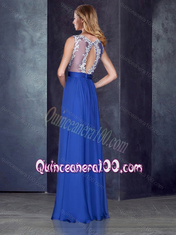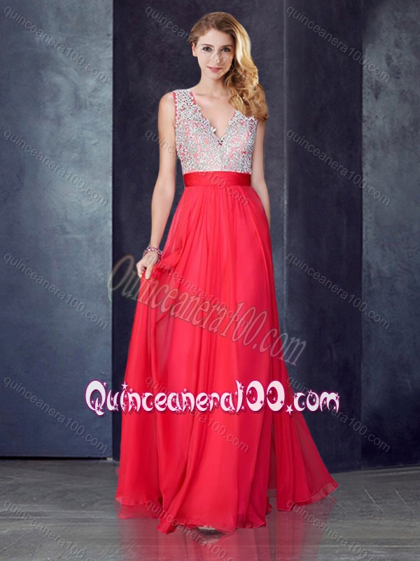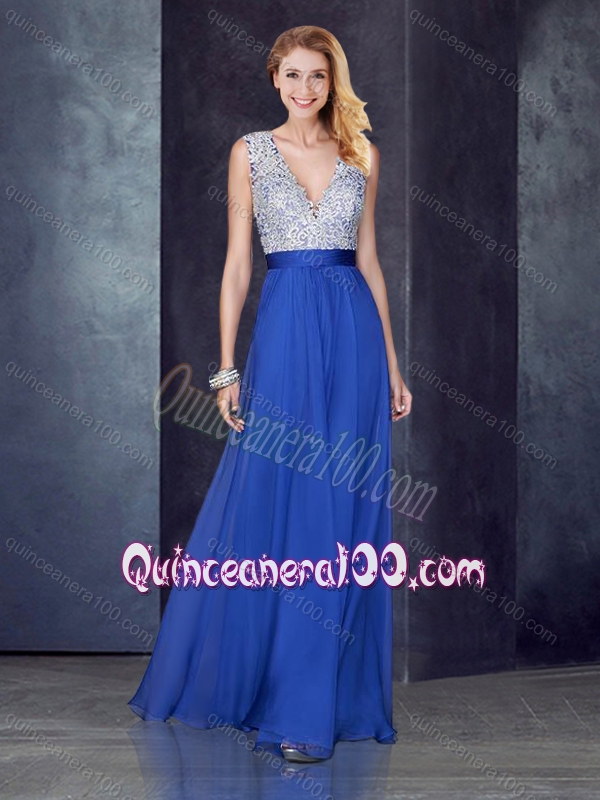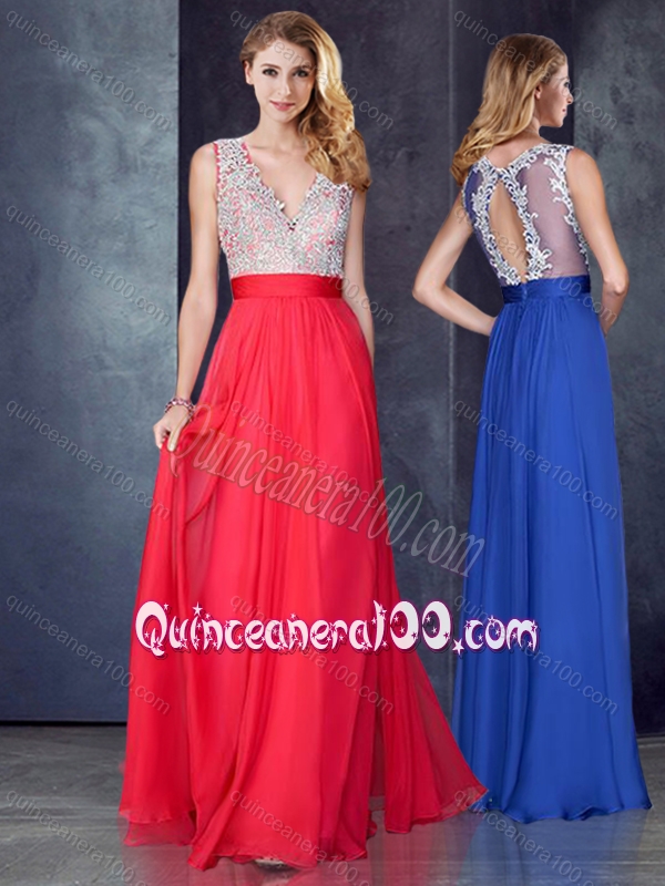 Neckline : V-neckShown Color : Red,BlueSleeve Length : sleevelessHemline : floor lengthBack Detail : BacklessFabric : ChiffonEmbellishment : Beading,AppliquesOccasion : PromSeason : Spring,Summer,Fall,Winter