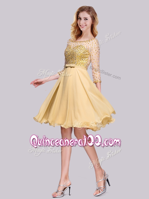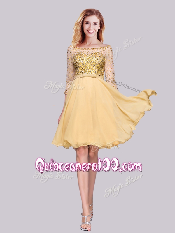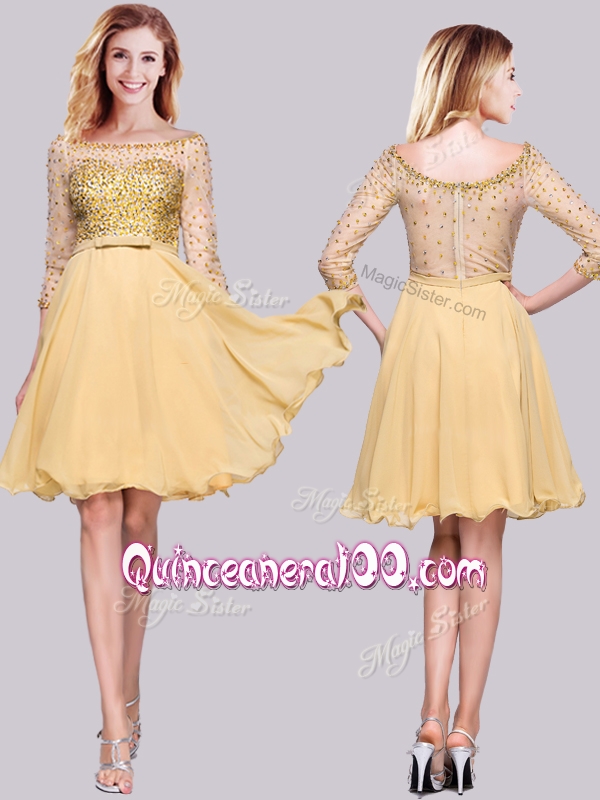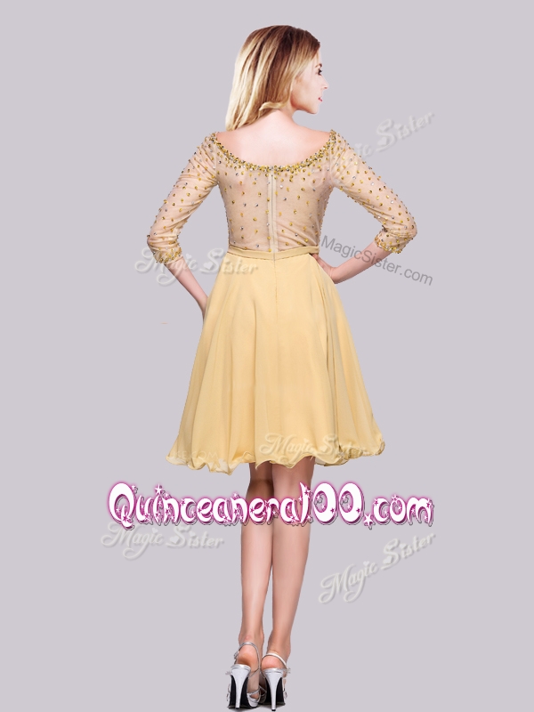 Neckline : ScoopShown Color : GoldSleeve Length : 3|4 length sleeveHemline : mini lengthBack Detail : ZipperFabric : ChiffonEmbellishment : BeadingOccasion : Prom,PartySeason : Spring,Summer,Fall