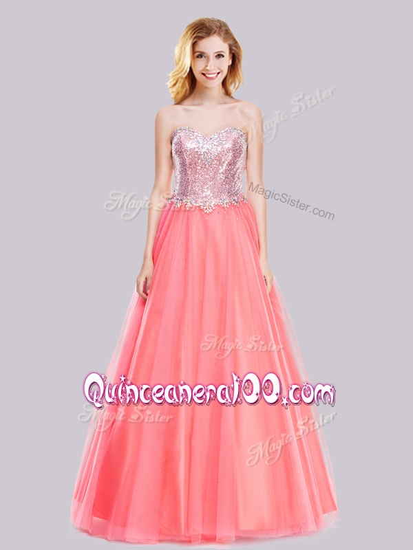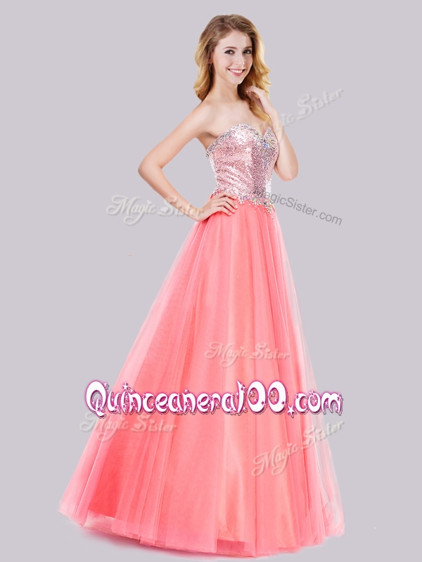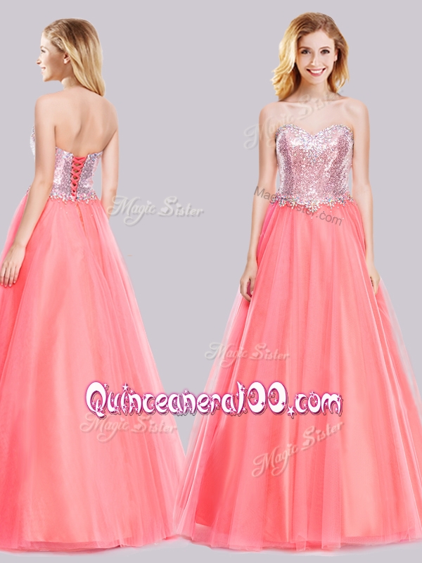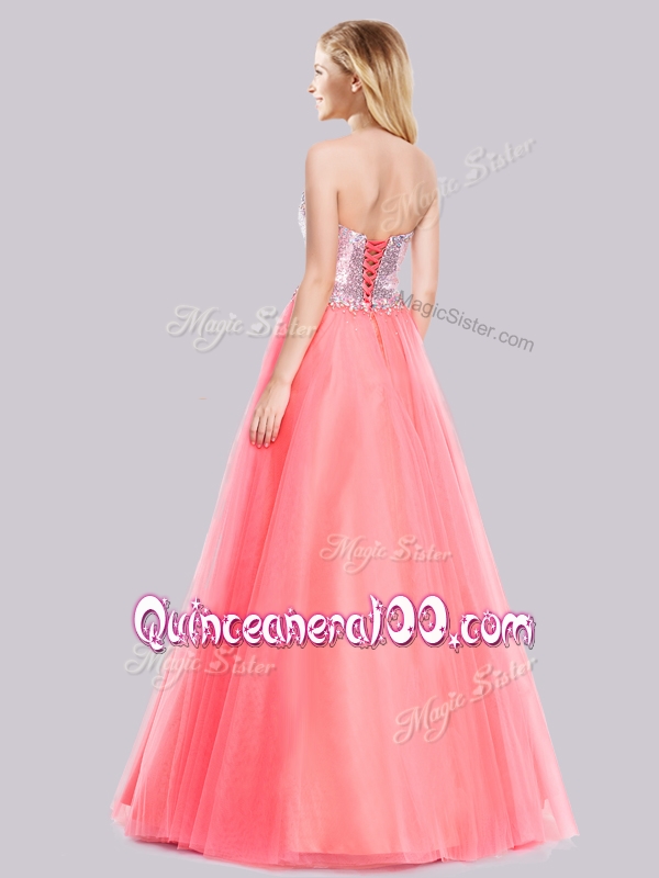Neckline : SweetheartShown Color : Watermelon RedSleeve Length : sleevelessHemline : floor lengthBack Detail : Lace upFabric : TulleEmbellishment : SequinsOccasion : PromSeason : Spring,Summer,Fall,Winter