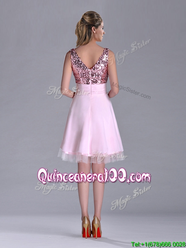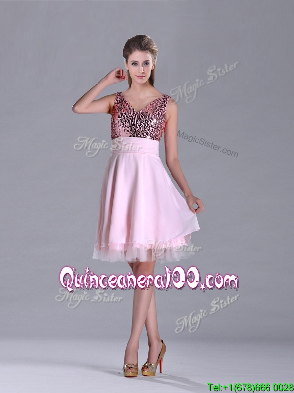 Neckline : V-neckShown Color : Baby PinkSleeve Length : sleevelessHemline : knee lengthBack Detail : ZipperFabric : ChiffonEmbellishment : SequinsOccasion : Prom,PartySeason : Spring,Summer,Fall