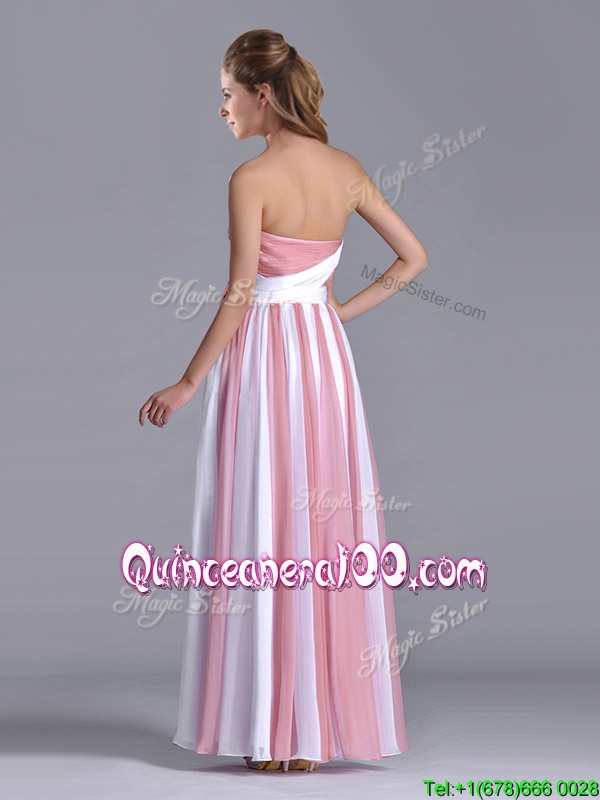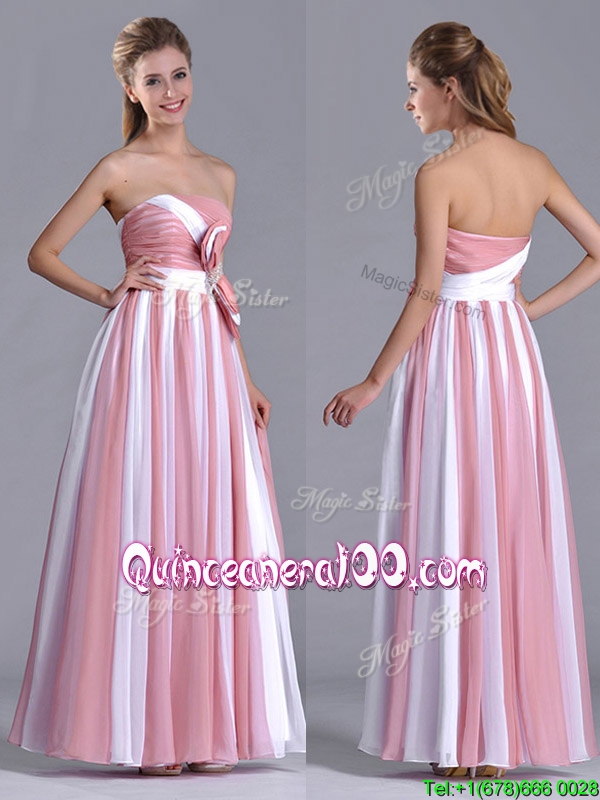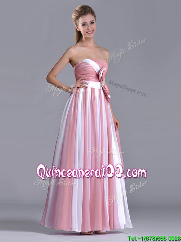 Neckline : StraplessShown Color : Pink And WhiteSleeve Length : sleevelessHemline : ankle lengthBack Detail : Side zipperFabric : ChiffonEmbellishment : BowknotOccasion : PromSeason : Spring,Summer,Fall,Winter