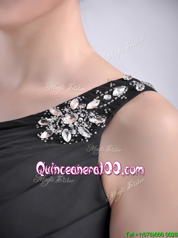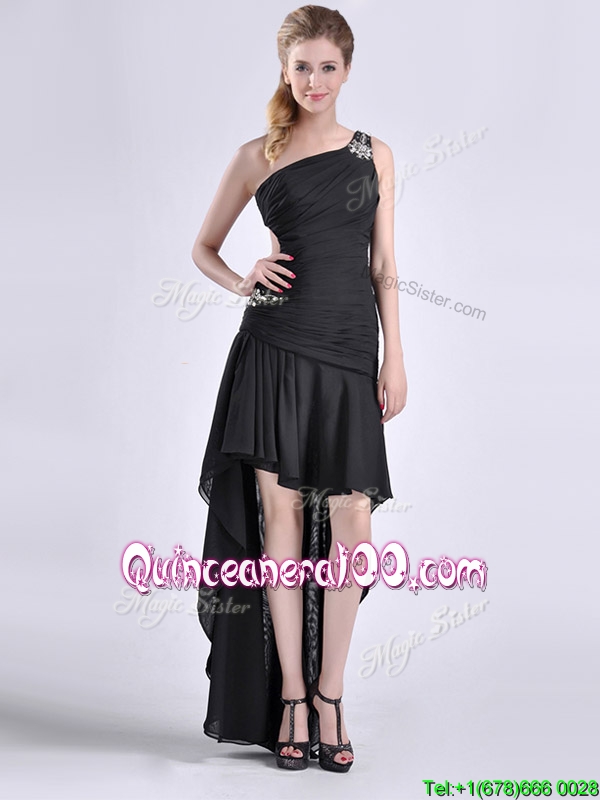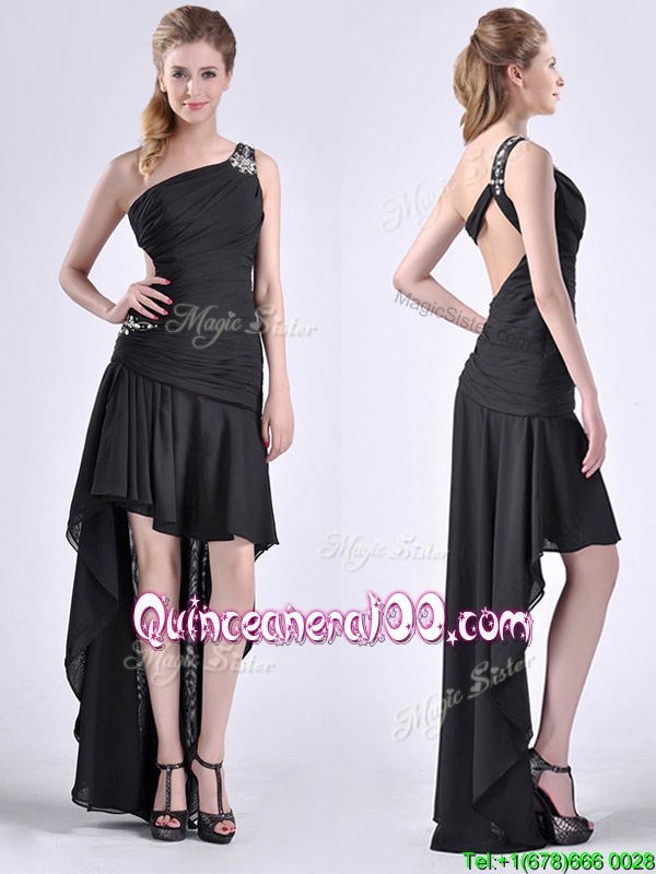 Neckline : One shoulderShown Color : BlackSleeve Length : sleevelessHemline : high lowBack Detail : Criss crossFabric : ChiffonEmbellishment : Beading,RuchingOccasion : PromSeason : Spring,Summer,Fall,Winter