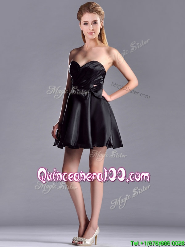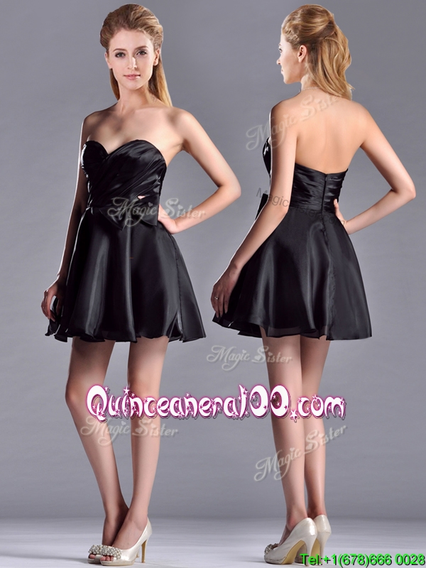 Neckline : SweetheartShown Color : BlackSleeve Length : sleevelessHemline : mini lengthBack Detail : ZipperFabric : OrganzaEmbellishment : BowknotOccasion : Prom,PartySeason : Spring,Summer,Fall