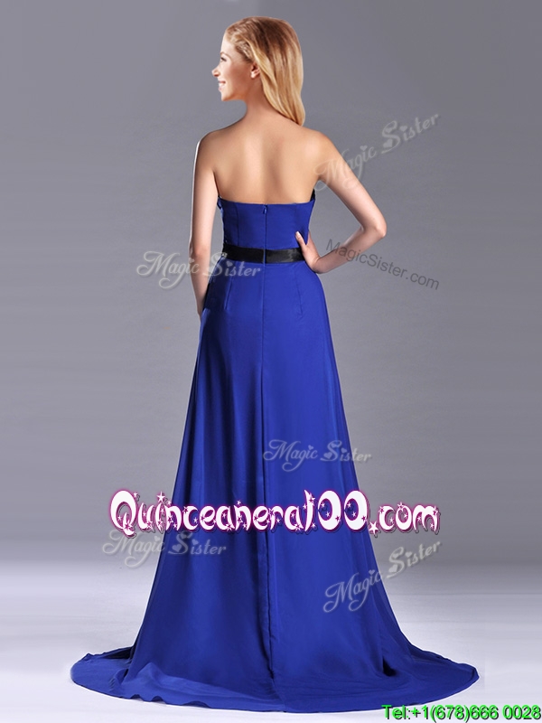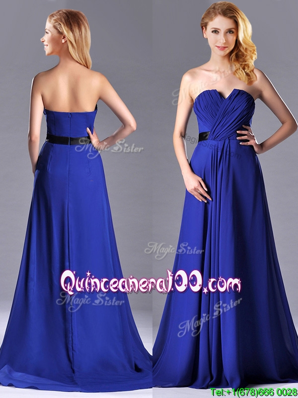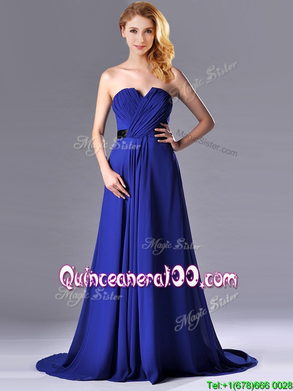 Neckline : V-neckShown Color : Royal BlueSleeve Length : sleevelessHemline : with trainBack Detail : ZipperFabric : ChiffonEmbellishment : RuchingOccasion : PromSeason : Spring,Summer,Fall,Winter