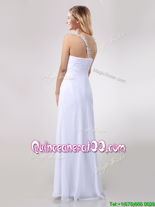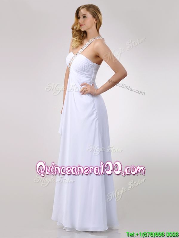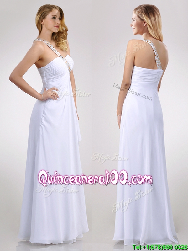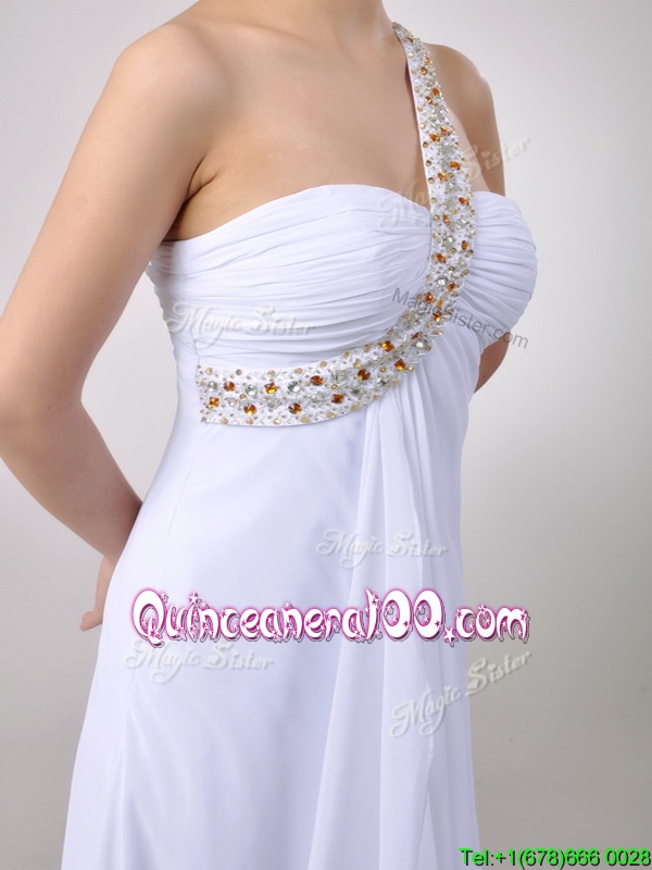 Neckline : One shoulderShown Color : WhiteSilhouette : EmpireSleeve Length : sleevelessHemline : floor lengthBack Detail : Side zipperFabric : ChiffonEmbellishment : BeadingOccasion : PromSeason : Spring,Summer,Fall,Winter