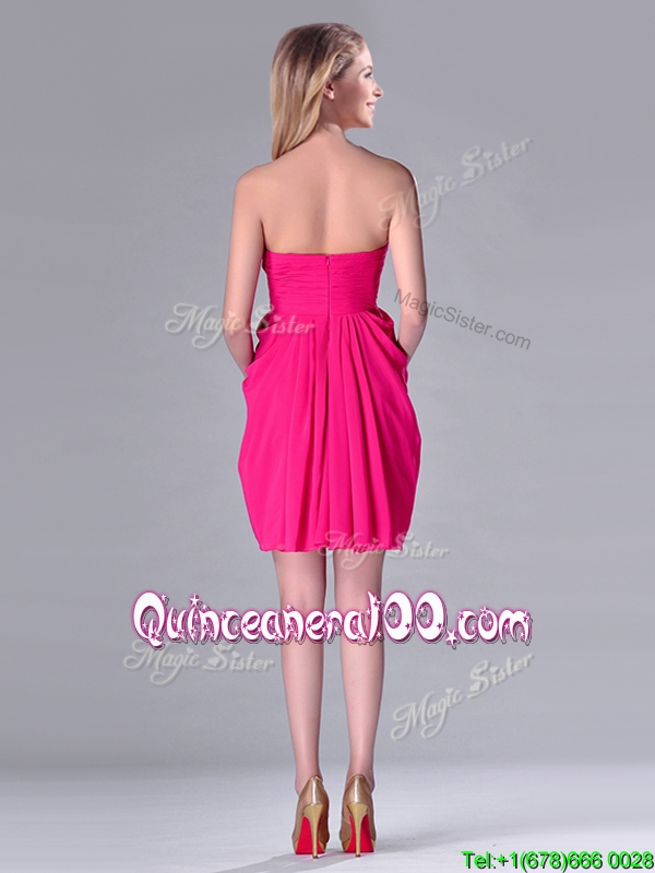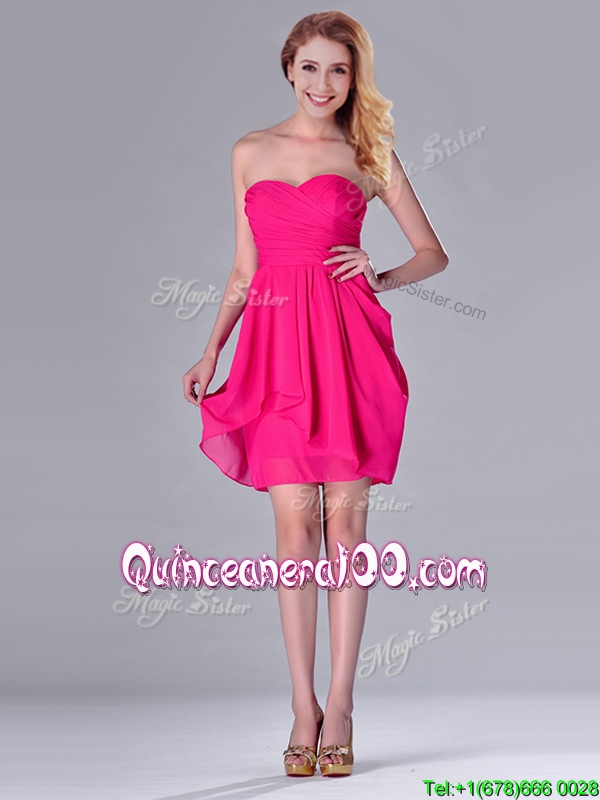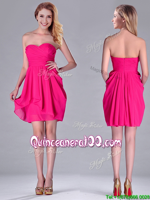 Neckline : SweetheartShown Color : Hot PinkSleeve Length : sleevelessHemline : mini lengthBack Detail : ZipperFabric : ChiffonEmbellishment : RuchingOccasion : Prom,PartySeason : Spring,Summer,Fall