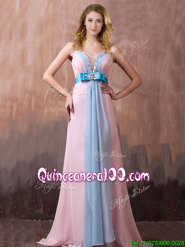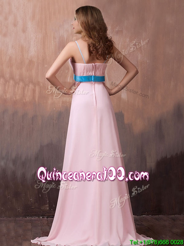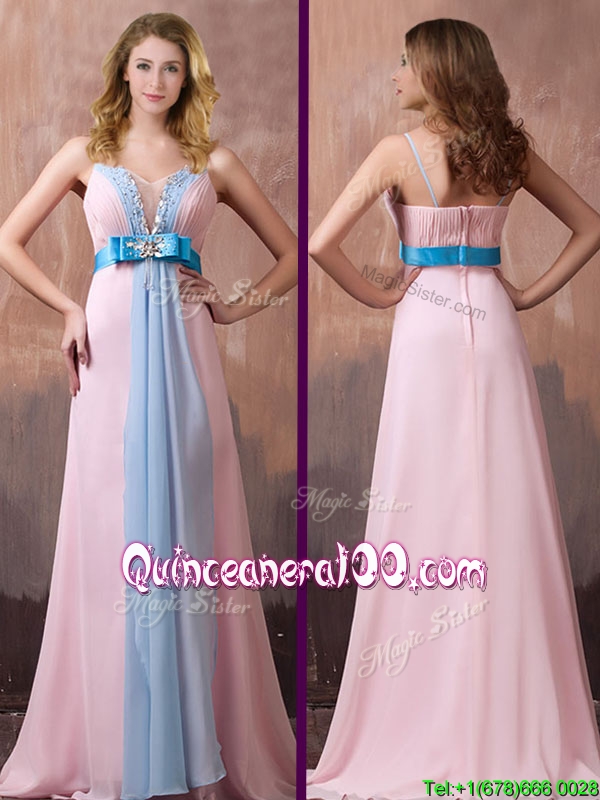 Neckline : Spaghetti strapsShown Color : Pink,BlueSleeve Length : sleevelessHemline : with trainBack Detail : ZipperFabric : ChiffonEmbellishment : Beading,BowknotOccasion : PromSeason : Spring,Summer,Fall,Winter