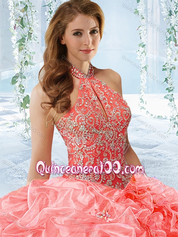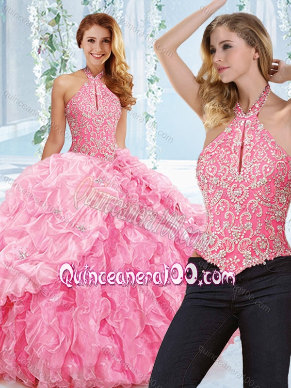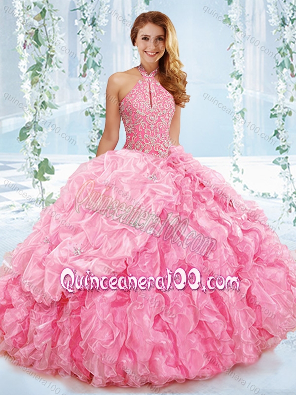 Neckline : Halter topShown Color : Rose PinkSilhouette : Ball GownsSleeve Length : sleevelessHemline : floor lengthBack Detail : Lace upFabric : OrganzaEmbellishment : Beading,RufflesOccasion : Military Ball,Sweet 16,QuinceaneraSeason : Spring,Summer,Fall,Winter