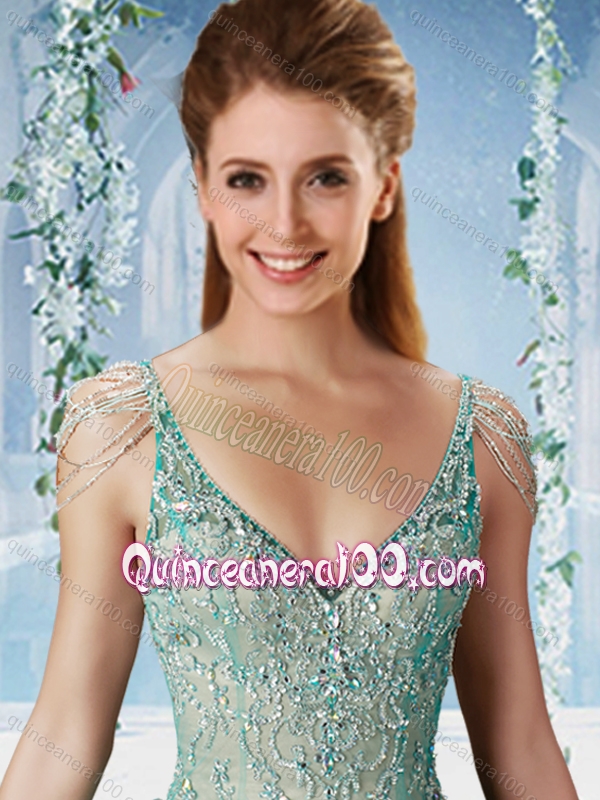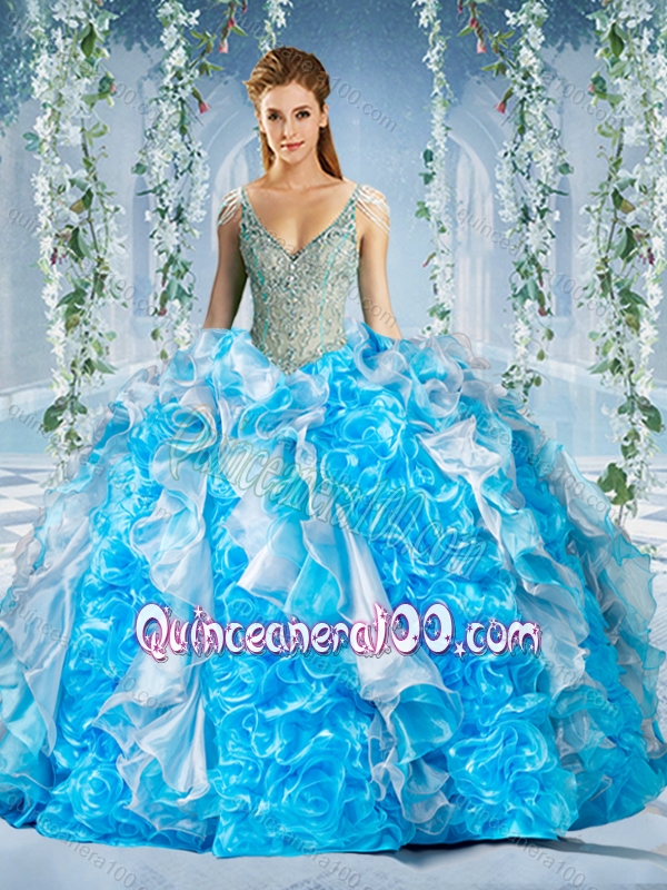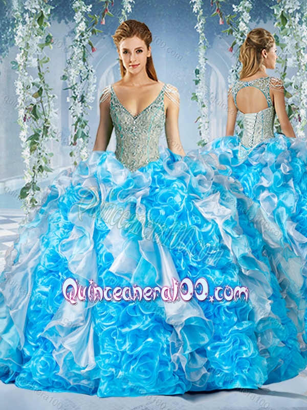 Neckline : V-neck Shown Color : Blue And White Sleeve Length : cap sleeves Hemline : floor length Back Detail : Lace up Fabric : Organza Embellishment : Beading,Ruffles Occasion : Military Ball,Sweet 16,Quinceanera Season : Spring,Summer,Fall,Winter