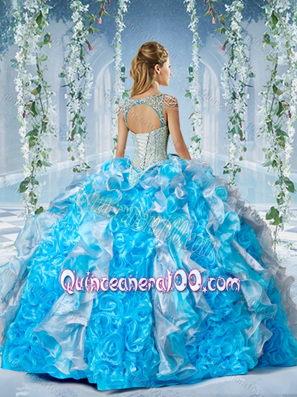 Exclusive Blue and White Quinceanera Dress in Beaded Decorated Cap Sleeves
