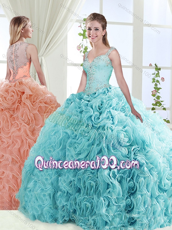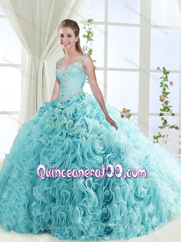 Neckline : Straps Shown Color : Baby Blue Sleeve Length : sleeveless Hemline : with train Back Detail : Zipper Fabric : Organza,Fabric With Rolling Flowers Embellishment : Beading Occasion : Military Ball,Sweet 16,Quinceanera Season : Spring,Summer,Fall,Winter