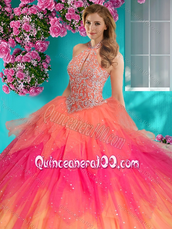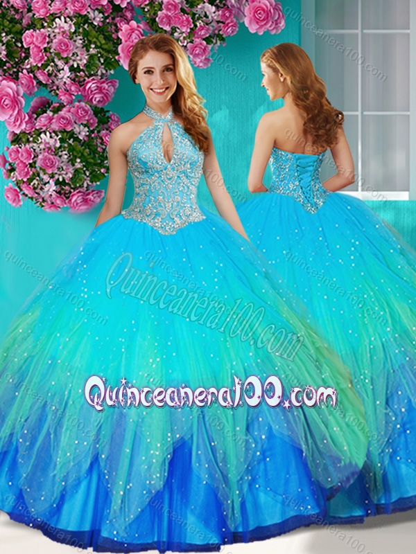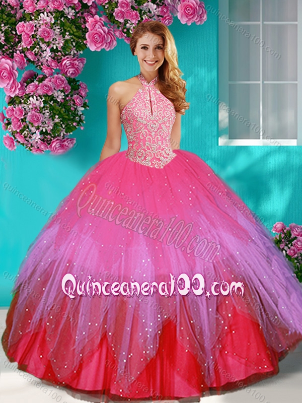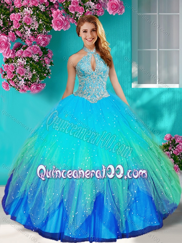 Neckline : Halter topShown Color : Multi-colorSleeve Length : sleevelessHemline : floor lengthBack Detail : Lace upFabric : TulleEmbellishment : Beading,AppliquesOccasion : Military Ball,Sweet 16,QuinceaneraSeason : Spring,Summer,Fall,Winter