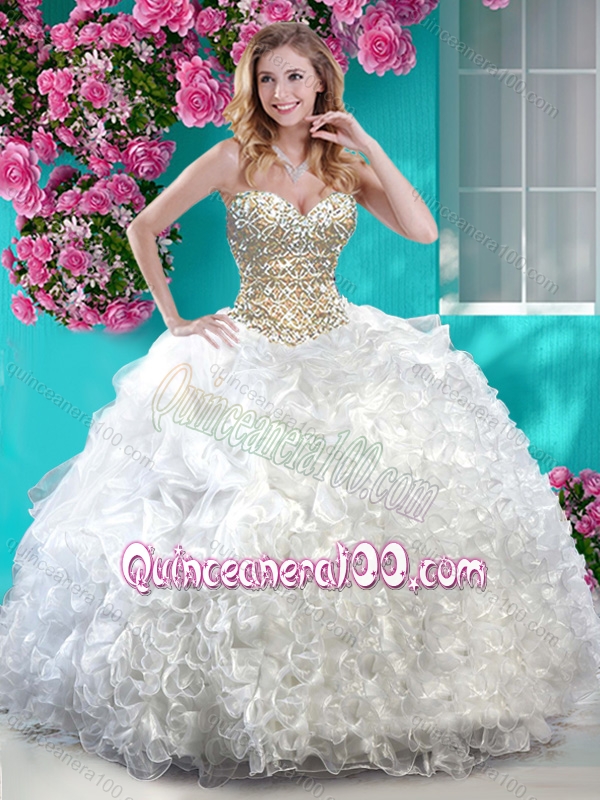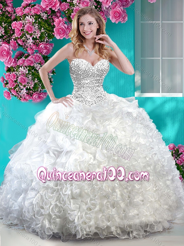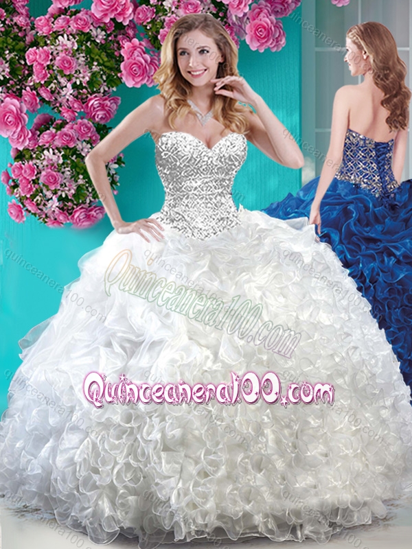 Neckline : SweetheartShown Color : WhiteSleeve Length : sleevelessHemline : floor lengthBack Detail : Lace upFabric : OrganzaEmbellishment : Beading,RufflesOccasion : Military Ball,Sweet 16,QuinceaneraSeason : Spring,Summer,Fall,Winter