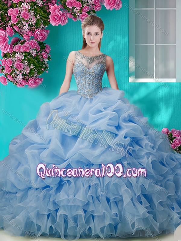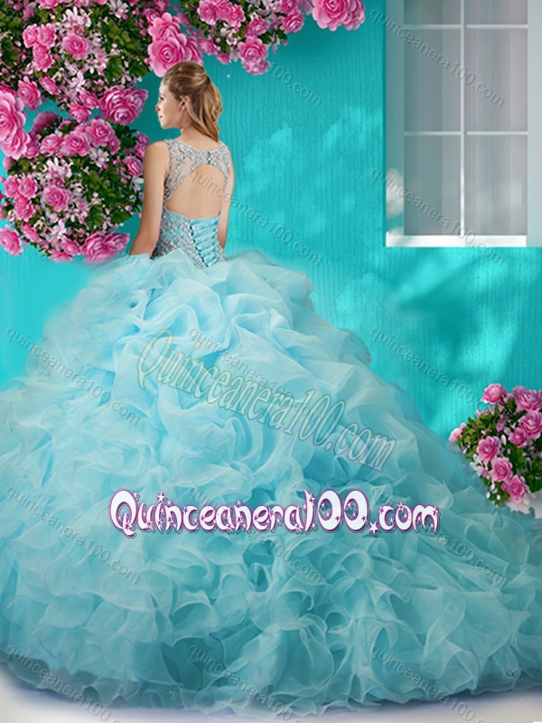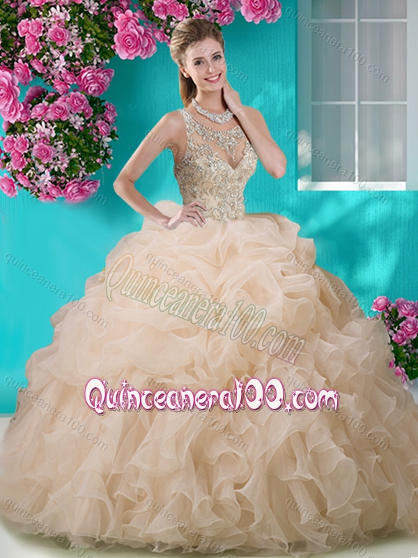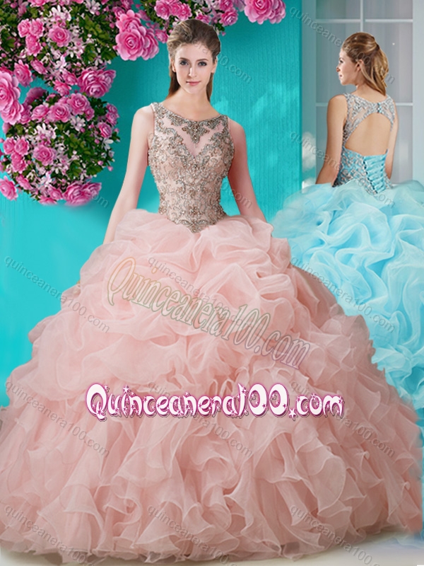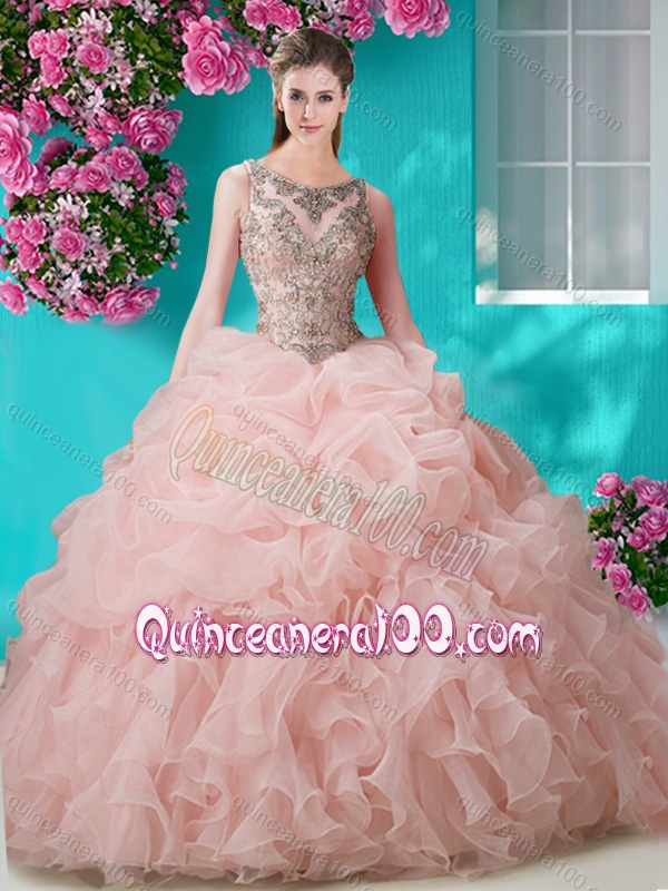Neckline : ScoopShown Color : PinkSilhouette : Ball GownsSleeve Length : sleevelessHemline : with trainBack Detail : BacklessFabric : OrganzaEmbellishment : Beading,RufflesOccasion : Military Ball,Sweet 16,QuinceaneraSeason : Spring,Summer,Fall,Winter
