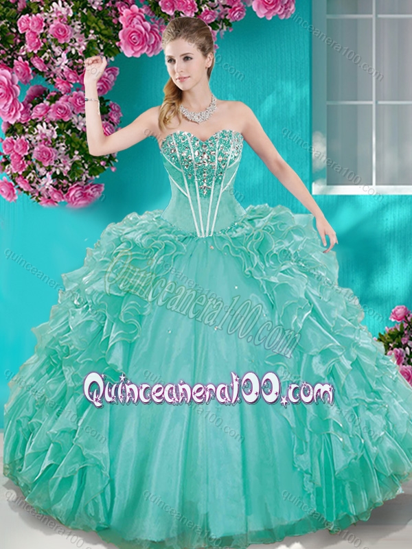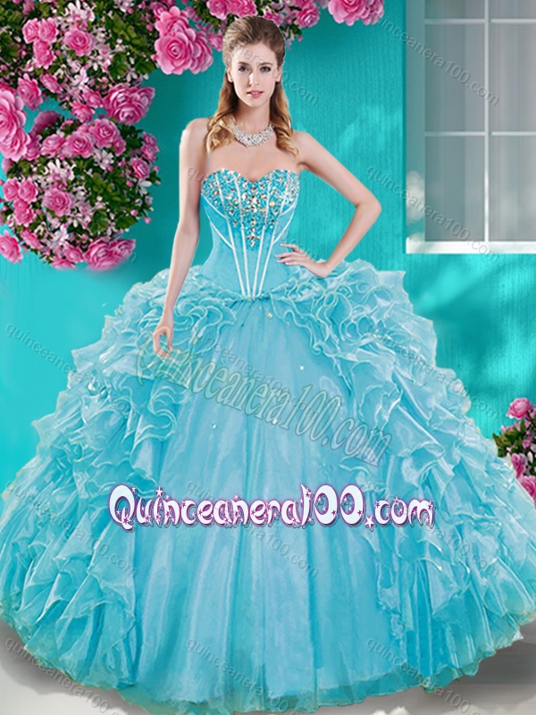 Neckline : Sweetheart Shown Color : Aqua Blue Sleeve Length : sleeveless Hemline : floor length Back Detail : Lace up Fabric : Organza Embellishment : Beading,Ruffles Occasion : Military Ball,Sweet 16,Quinceanera Season : Spring,Summer,Fall,Winter