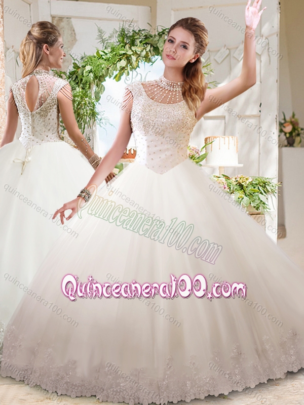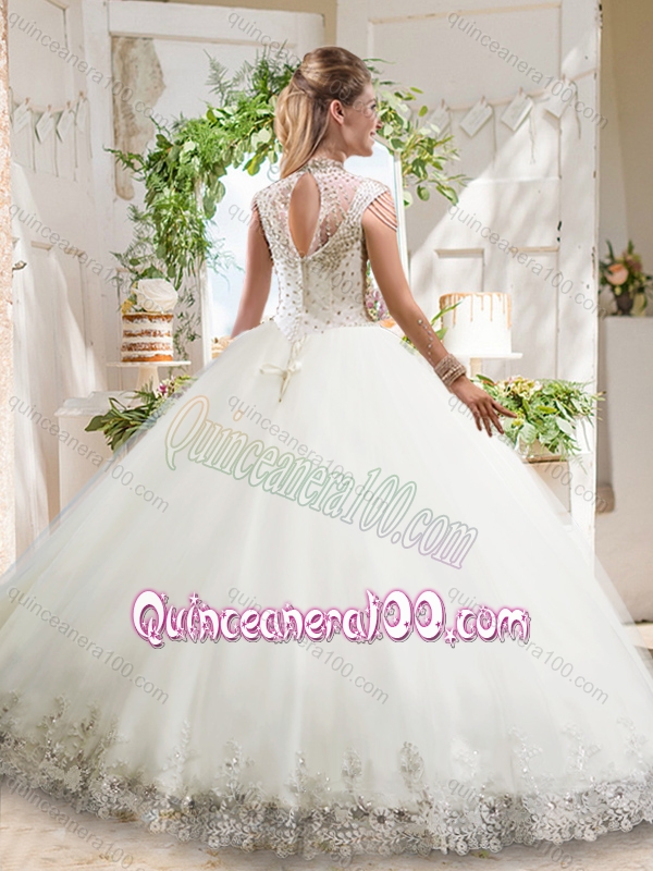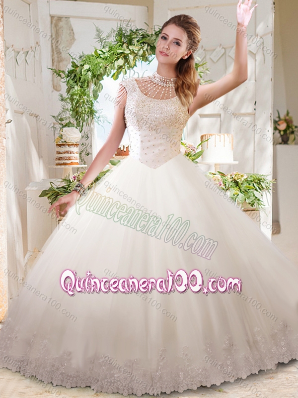 Neckline : High-neckShown Color : WhiteSilhouette : Ball GownsSleeve Length : sleevelessHemline : floor lengthBack Detail : ZipperFabric : TulleEmbellishment : Beading,LaceOccasion : Military Ball,Sweet 16,QuinceaneraSeason : Spring,Summer,Fall,Winter