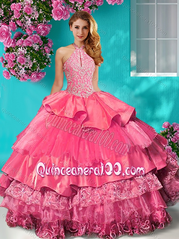 Neckline : Halter top Shown Color : Rose Pink Sleeve Length : sleeveless Hemline : with train Back Detail : Lace up Fabric : Organza,Taffeta Embellishment : Beading,Appliques,Ruffled Layers Occasion : Military Ball,Sweet 16,Quinceanera Season : Spring,Summer,Fall,Winter