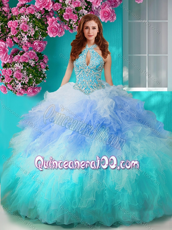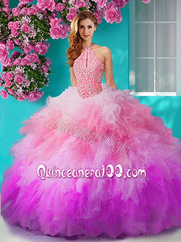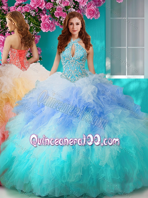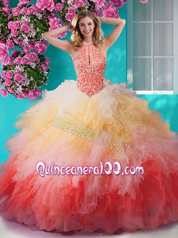 Neckline : Halter topShown Color : Multi-colorSleeve Length : sleevelessHemline : floor lengthBack Detail : Lace upFabric : OrganzaEmbellishment : Beading,RufflesOccasion : Military Ball,Sweet 16,QuinceaneraSeason : Spring,Summer,Fall,Winter