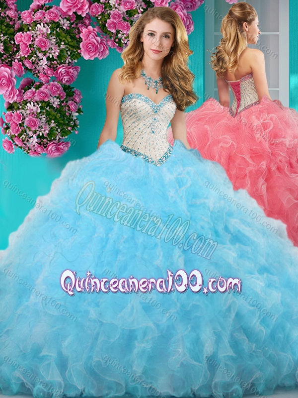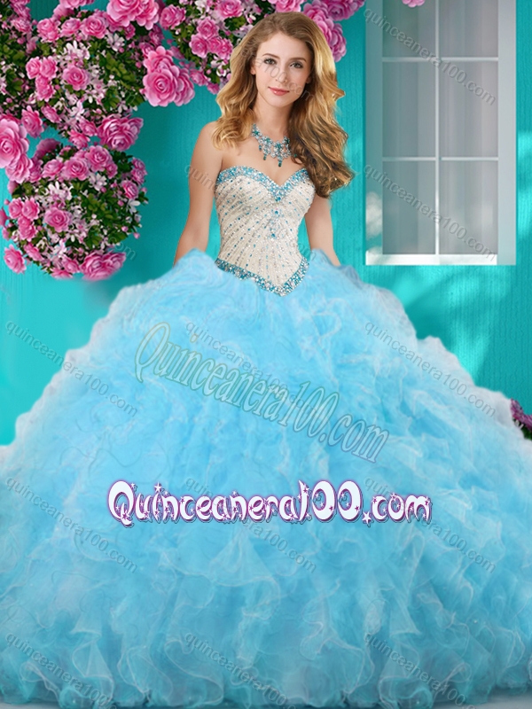 Neckline : SweetheartShown Color : Light BlueSleeve Length : sleevelessHemline : floor lengthBack Detail : Lace upFabric : OrganzaEmbellishment : Beading,RufflesOccasion : Military Ball,Sweet 16,Quinceanera,BeachSeason : Spring,Summer,Fall,Winter