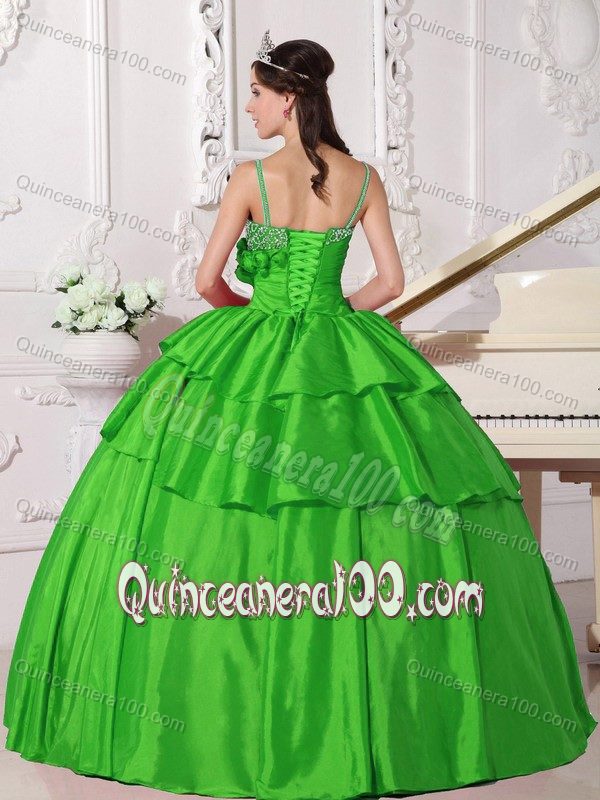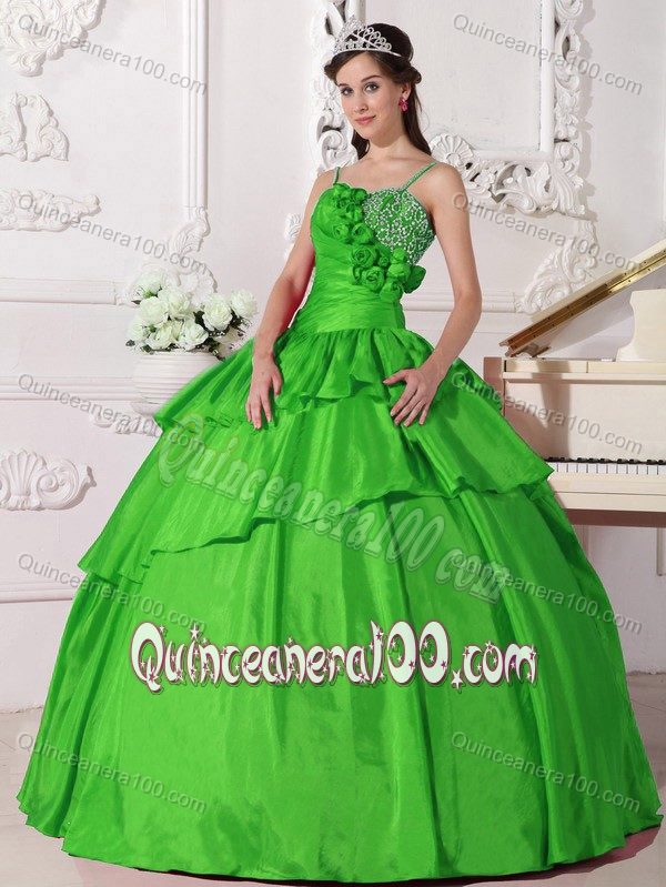 Neckline : Spaghetti strapsShown Color : Spring GreenSilhouette : Ball GownsSleeve Length : sleevelessHemline : floor lengthBack Detail : Lace upFabric : TaffetaEmbellishment : Beading,Hand Made FlowerOccasion : Sweet 16,QuinceaneraSeason : Spring,Summer,Fall,Winter