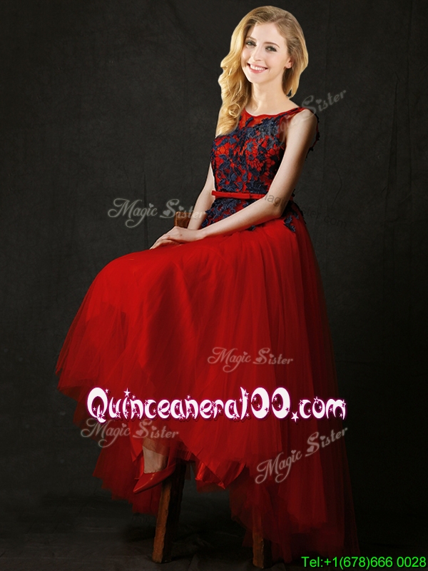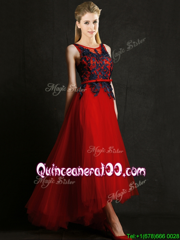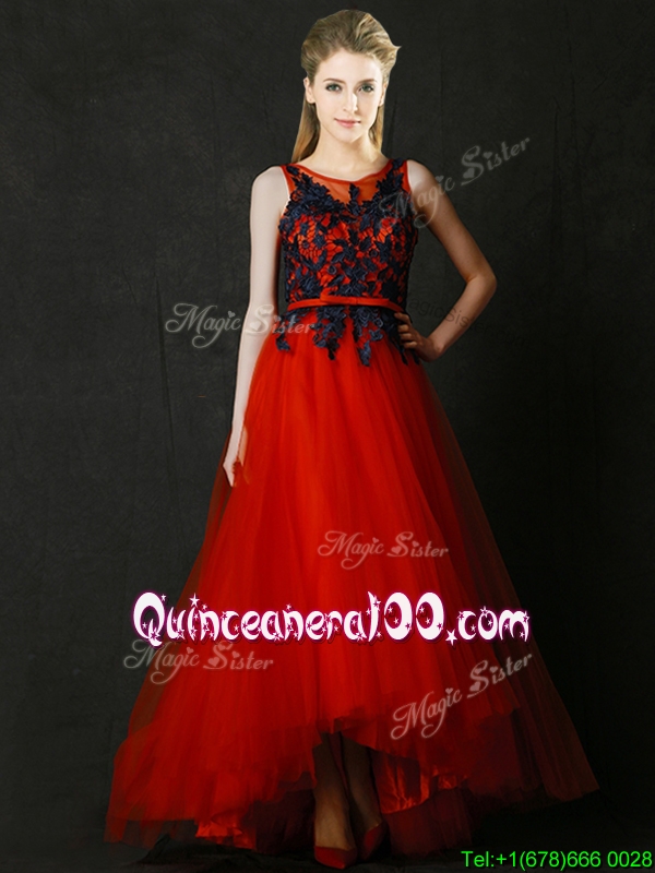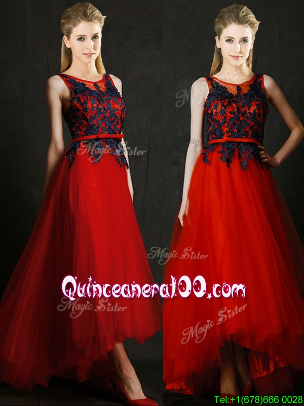 Neckline : ScoopShown Color : RedSleeve Length : sleevelessHemline : high lowBack Detail : ZipperFabric : TulleEmbellishment : Appliques,BeltOccasion : Prom,PartySeason : Spring,Summer,Fall,Winter