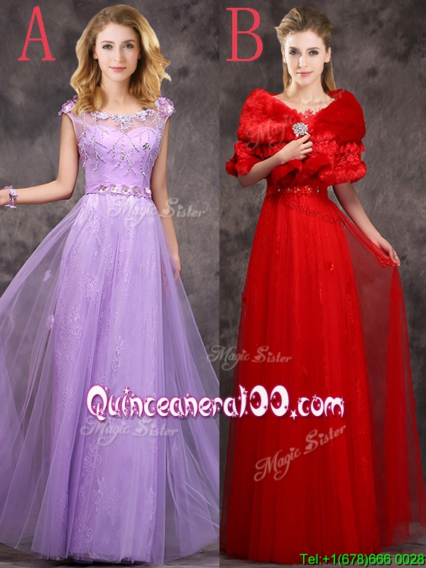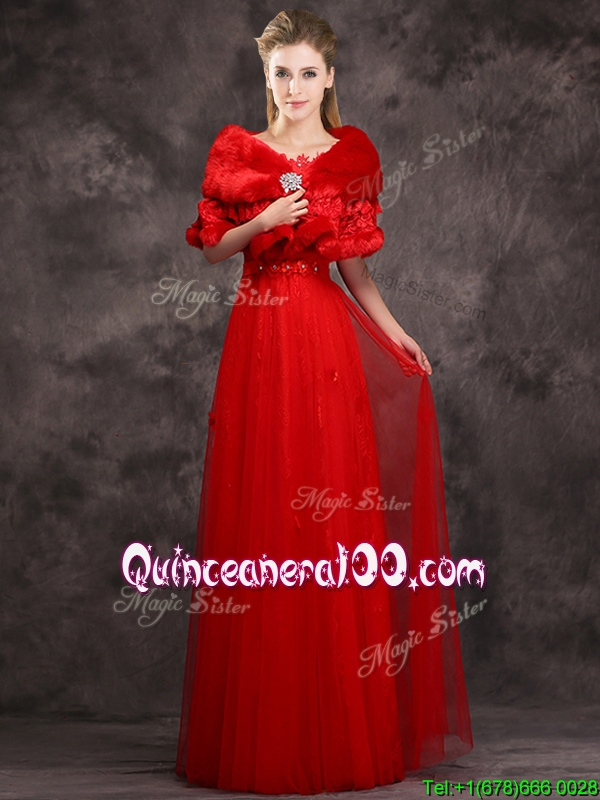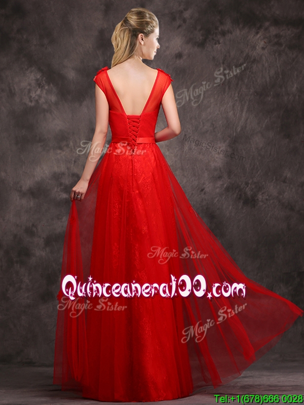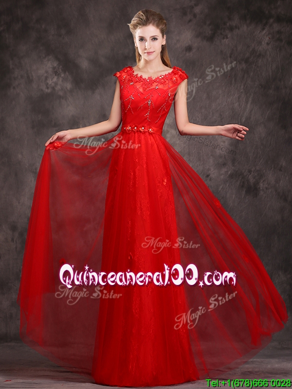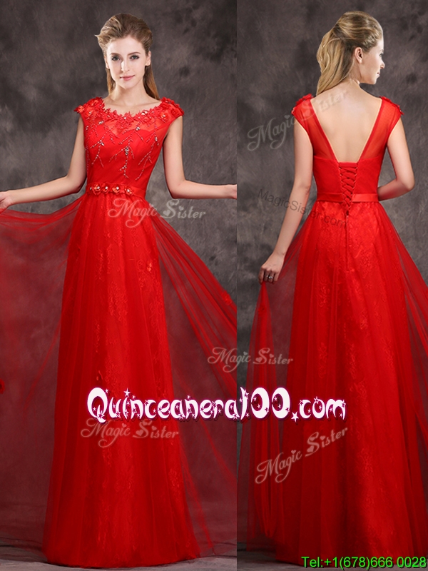Neckline : ScoopShown Color : RedSilhouette : EmpireSleeve Length : cap sleevesHemline : floor lengthBack Detail : Lace upFabric : TulleEmbellishment : Beading,AppliquesOccasion : Prom,PartySeason : Spring,Summer,Fall,Winter