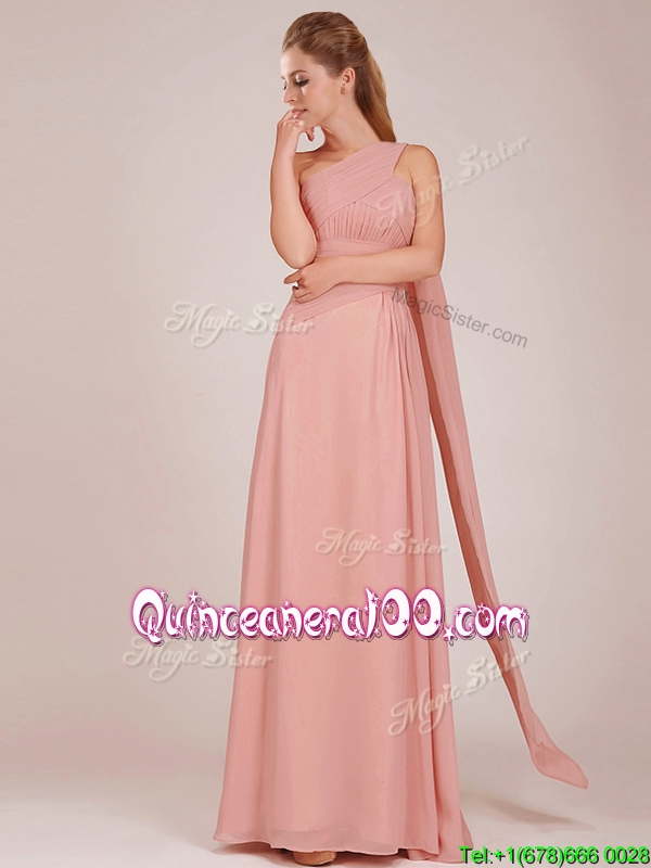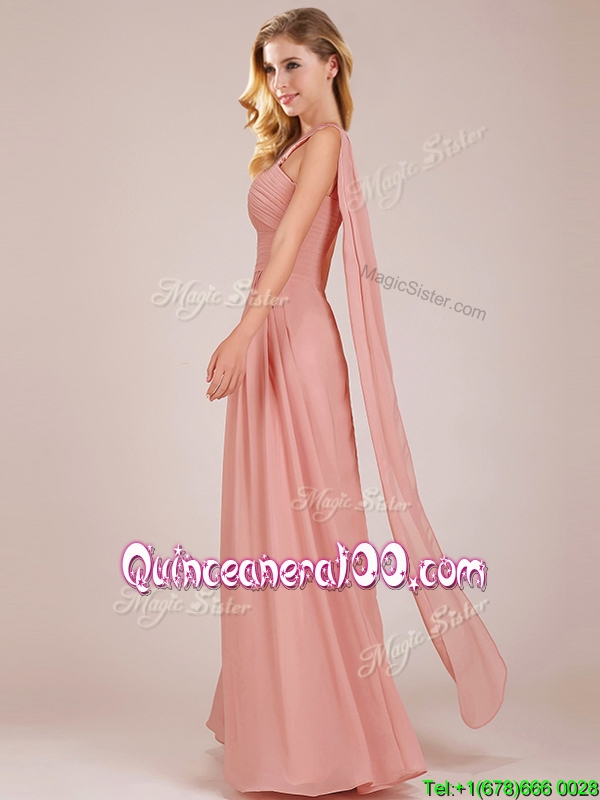 Neckline : One shoulderShown Color : PeachSleeve Length : sleevelessHemline : floor lengthBack Detail : ZipperFabric : ChiffonEmbellishment : RuchingOccasion : Prom,PartySeason : Spring,Summer,Fall,Winter