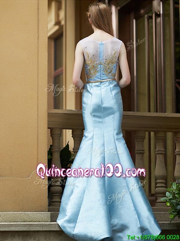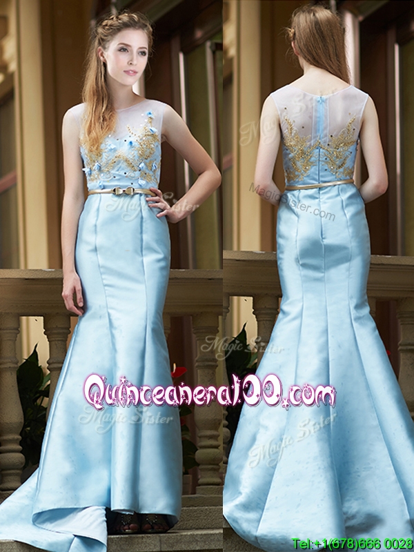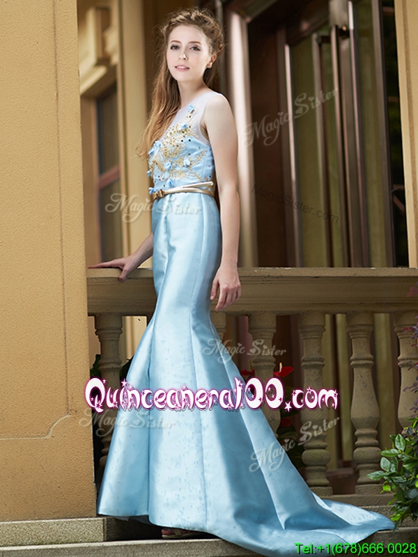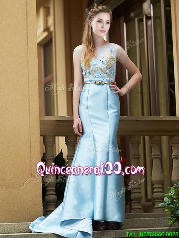 Neckline : ScoopShown Color : Light BlueSleeve Length : sleevelessHemline : with trainBack Detail : ZipperFabric : SatinEmbellishment : Appliques,BeltOccasion : Prom,PartySeason : Spring,Summer,Fall,Winter